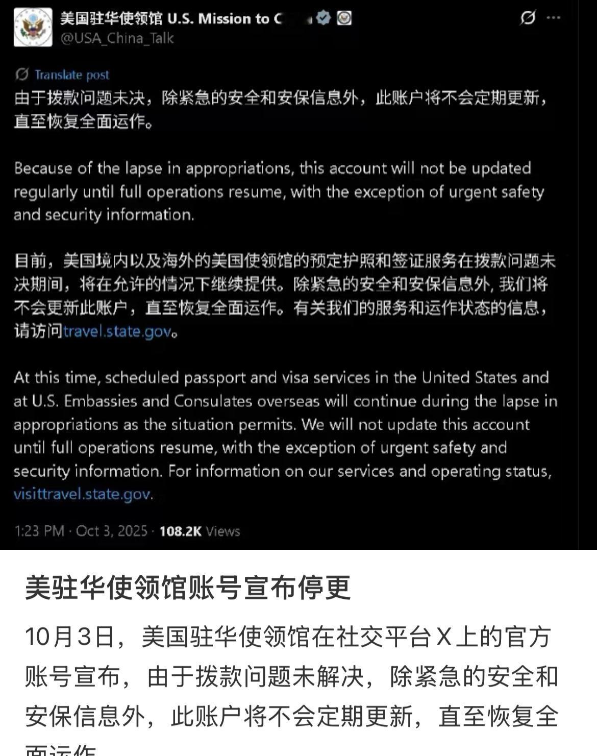 美驻华领馆突然官宣! 社交账号停更, 只留紧急通知通道——这哪是没钱更新, 分明是美国政治烂到根上的遮羞布被扯下来了! 10月1日政府“停摆”,75万人无薪休假,副总统喊着要裁员,两党却还在空调房里掐架。 就因为共和党法案没算医保补贴,民主党死活不松口,把国家运转当筹码,哪管老百姓活不活。 这戏码40年演了14回,早成了“固定节目”。2019年那次停摆35天,110亿打水漂,病人等救命药、员工欠房贷的惨状还没忘,现在又来折腾。 空中交通管制员本就缺4000人,如今无薪硬扛,万一出事就是机毁人亡,这哪是党争,是拿人命赌! 更讽刺的是,学界早建议搞“自动拨款”堵漏洞,可两党都怕丢了要挟对方的筹码,压根不办。连国际评级机构都把美国信用从“AAA”下调,他们还在窝里斗。 美领馆停更只是小信号,再拖下去签证办不了、货物堆港口、科研全停摆,受伤的全是普通人。 华盛顿当年警告“党争是共和敌人”,现在早成了耳旁风。 治国本该是为百姓托底,不是拿国家当棋盘。 这种把私利凌驾于公共利益之上的闹剧,早该停了!你们说,这样的党争到底啥时候才是头?美国驻华大使 美国驻华大使馆 美国驻华使馆