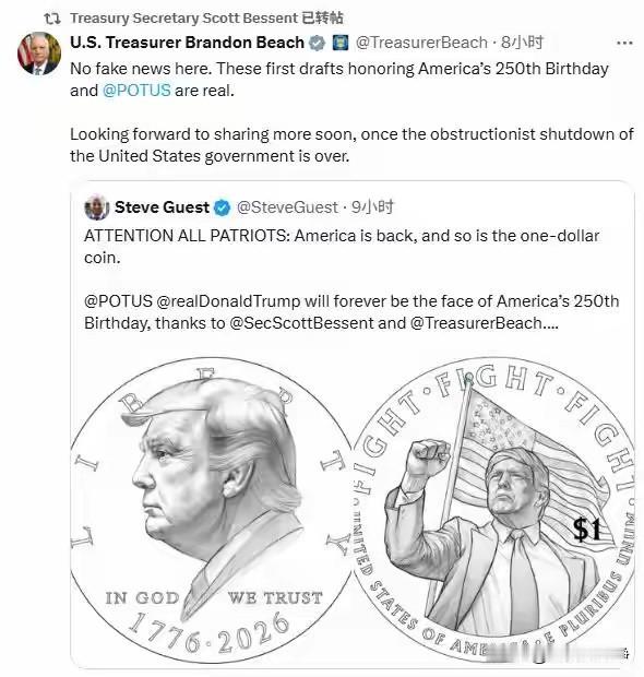 好大喜功啊,特朗普的好大喜功已经到了极端的程度了!近日美国财政部爆料称,正在考虑铸造面值一美元的新硬币,而这枚硬币正反两面都有美国总统特朗普的肖像。 这枚硬币就是用来纪念美国建国250周年,也就是明年! 二百五了?真快呀,美国都二百五了! 目前网上已经爆料了硬币的图案,正面是特朗普的侧面头像图。 背面则是特朗普中弹之后,举着拳头高喊战斗的经典画面。 上面还有自由以及我们信仰上帝的文字! 目前已经有美国财政部的官员对媒体表示这不是虚假新闻,这都是真的! 这些设计图全都是真的,如果不是美国政府停摆的话,财政部肯定会有更多的消息流出的。 当然了,美国cnn也曾经做过报道,目前尚不知这枚新硬币是否会引发一些司法冲突? 相信民主党,应该不会让这枚硬币顺利的出炉! 挺有意思的,其实这枚硬币如果真的出现了,心净我也要搞一枚收藏。 反正面值就是一美元,也不贵! 主要原因就是特朗普是美国历史上非常罕见的一个总统。 他身上的戏实在是太多了,未来历史书上一定会浓墨重彩的,给他留几笔的。 这么戏精的总统,真的是全球罕见!