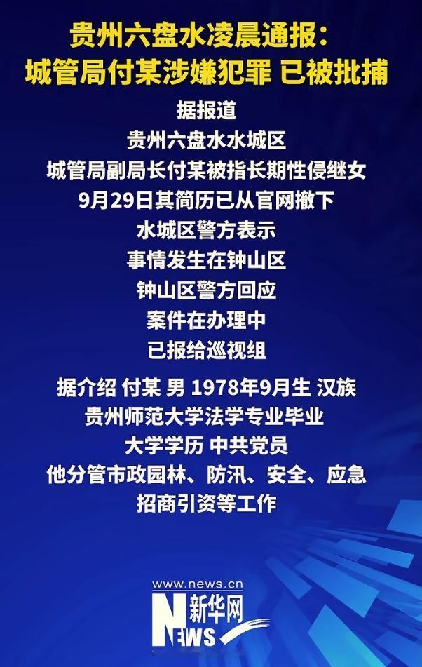 实锤了,六盘水城管副局长性侵继女! 在报道中使用的是:“付某长期性侵继女。”而非强奸。 在法律上,性侵与强奸是包含与被包含的关系。性侵的证据要求相对较低,只需证明行为违背受害人意愿。 付局长作为继父从继女9岁开始进行性侵,而且长达数年,用性侵而非强奸更为专业。 作为母亲自己的女儿被继父强奸数年而没有发现,也确实非常粗心。 这也给带女再婚的母亲们敲响了警钟,知人知面不知心,再婚慎重考察好对方人品。