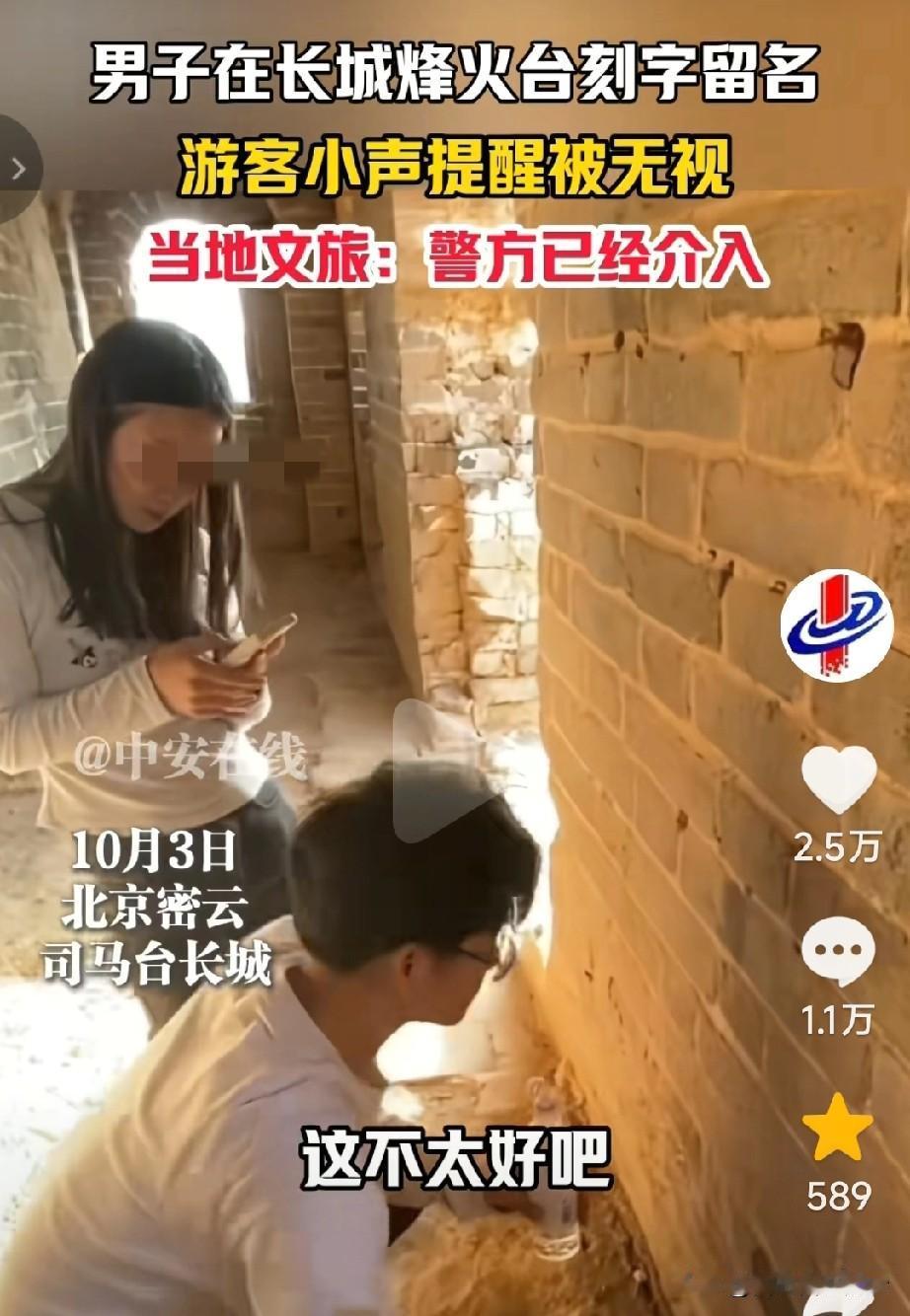 年轻情侣在长城上刻字,有个游客看到了,好心提醒,“这不太好吧。”本以为他们是有素质的人,会停止。 结果两人却装听不见,男生继续在城墙上刻字,女生则笑嘻嘻的拍视频。男生刻的大概是自己和女友的名字,还画了一个爱心。 真的不能理解,把名字刻在城墙上你俩就能永结同心了?你们的感情能不能到永远我不知道,但是民警通过你刻的名字很快就能找到你了。 现在北京密云的公安机关已经介入调查此事,两人也会为破坏文物罪受到应有的惩罚。真的大快人心! 小朋友都知道不能在文物古迹上乱涂乱画。两个接受教育的大人,连小孩都不如,可悲!