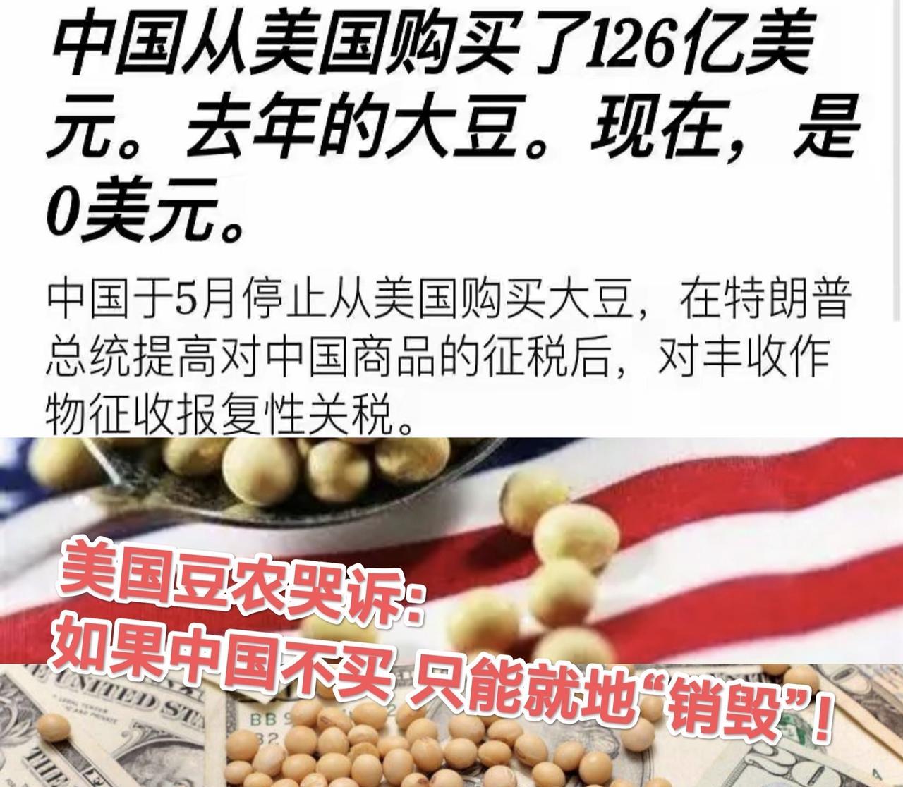美国豆农哭诉:救救我们吧!这不是天灾 而人祸,就是特朗普关税惹的祸!中国条件:取消关税,再谈购买大豆!美国豆农们清楚:只有中国才能救他们! 美国豆农们迎来的大豆的丰收季,但美国豆农们发现全球最大的买家中国没有下一个大豆订单,美国豆农们苦心经营 30 多年的中国大豆市场 说没就没了,豆农们心都快粹了,只能求助于美国特朗普,特朗普只能告诉豆农们“等等吧”!可是大豆生存周期不能等呀,再等 就废了 烂了! 豆农们都很清楚,唯有中国市场才能救美国豆农,只有中国才能挽回美国豆农的损失,如今豆农们贷款购买进口高价格的化肥 高关税下购买的收割机及设备 ,这一笔笔钱都是真金白银,而且是向美国银行贷款的,豆农们很清楚,如果大豆卖不出去,银行接下来的动作会让豆农们倾家荡产的!根本没有“生存下去”的希望,但他们已经多次求助于美国政府,但美国政府根本没有能力!因为他们心中只有“关税”! 英国《金融时报》报道也说,美国今年大豆满仓、但价格下跌,农民难以维持生计。“美国头号出口农产品的海外销售量骤降,给美农造成‘毁灭性’打击。” 卖不出去,满仓的大豆只能“戝卖”,卖不出去,甚至烂在地里节省收割的劳动力成本,卖不出去,只能拍卖收割机设备或房产 还银行贷款,但显然美国政府如今没有更好的办法,当一个政府只能政客们利益服务的时候,曾经支持特朗普的豆农们将会用“反残忍”手段对付特朗普政府,这一切均由于特朗普背世界经济发展潮流而行而酿成的大祸。 特朗普的关税坑了世界,也坑了美国农民,就算现在美国政府低下头来与中国谈判或取消关税,但也赶不上美国大豆收获季节了,同时 也因为中国已经大量购买南美洲阿根廷的大豆,中国不可能大量取消阿根廷订单转向购买美国的,而阿根廷为了表示地中国大豆购买力的感谢,取消了出口关税,由之前大豆以及豆油和豆粕的出口税曾分别高达26%和24.5%,如今已降为零,导致宣布的后的短短两天内销售额就达到70亿美元。 美国“政客新闻网”表示,中方的策略似乎正在奏效,之前大力支持特朗普的农业游说团体纷纷向白宫抱怨,称其关税政策是中国拒绝美国农产品的“罪魁祸首”,农民的抗议也此起彼伏。而美国除了给美国民众开“开空支票”之外,什么也没干! 只有中国才能救美国豆农,这是美国豆农发自内心的诉求:帮帮我们吧!