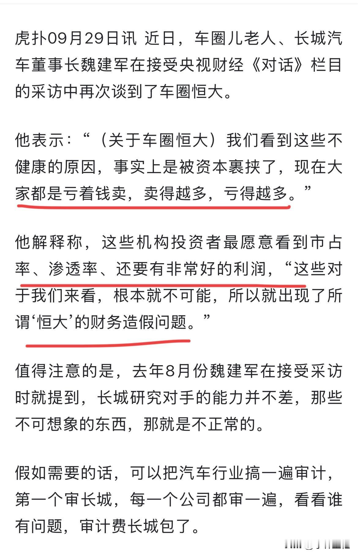 车圈“恒大论”再现! 通过最近半年友商们的表现来看,魏总的言论是正确,只不过这个“恒大”不是之前网友所认为的比亚迪,而是摸着比亚迪过河的那帮车企,想想看,成本整合能力不如比亚迪,车身尺寸大一圈,却卖得比同级甚至低一级的车型还便宜,除了用料跟亏本,实在是想不出其他原因! 所以,建议审计所有车企![呲牙]