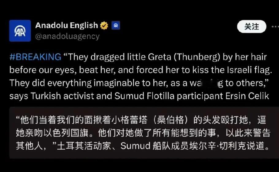 格蕾塔这孩子可遭罪了!以色列人丝毫没有惯着她。 加沙援助船队成员埃尔辛.切利克对阿纳多卢通讯社等媒体披露了格蕾塔被以色列人抓住后遭受了非人的虐待。 切利克称:以色列人当着大伙的面,揪着格蕾塔的头发殴打她,逼她爬行,逼她亲吻以色列国旗。以色列人对她做了所有能想到的事,以此警告其他人。 以色列人竟然懂得“杀鸡给猴看”这一招:不老实的,格蕾塔的下场就是你们的下场! 不仅如此,以色列人把格蕾塔从船上押走后,把她关在有臭虫的牢房里,据说不给饭吃,不给水喝。 而瑞典只是派出大使馆的工作人员去看望了一下,安慰了她几句,就没有下文了。 格蕾塔这是第三次去加沙了。第一次去船被无人机给炸了,第二次她被以色列抓了然后放了。看来以色列人也讲事不过三,所以第三次格蕾塔又来了,以色列人表示很生气,不给她点颜色瞧瞧,她是不会知道马王爷长几只眼的。所以这次抓住她之后,估计是没有好果子吃的。 对格蕾塔本人及她的行动,我不想发表什么评论,我只是个吃瓜群众而已。不过我感觉以色列这样做,确实也太过分了点,人家就是去送点吃的,又不是给加沙人送飞机大炮,用不着这样对待他们。 以色列的所作所为,其实是在将他们这个民族,完全置于全世界大多数人民的对立面。别看今日跳得欢,就怕以后拉清单。犹太民族的未来,会因此存在许多变数,祝他们好运吧。