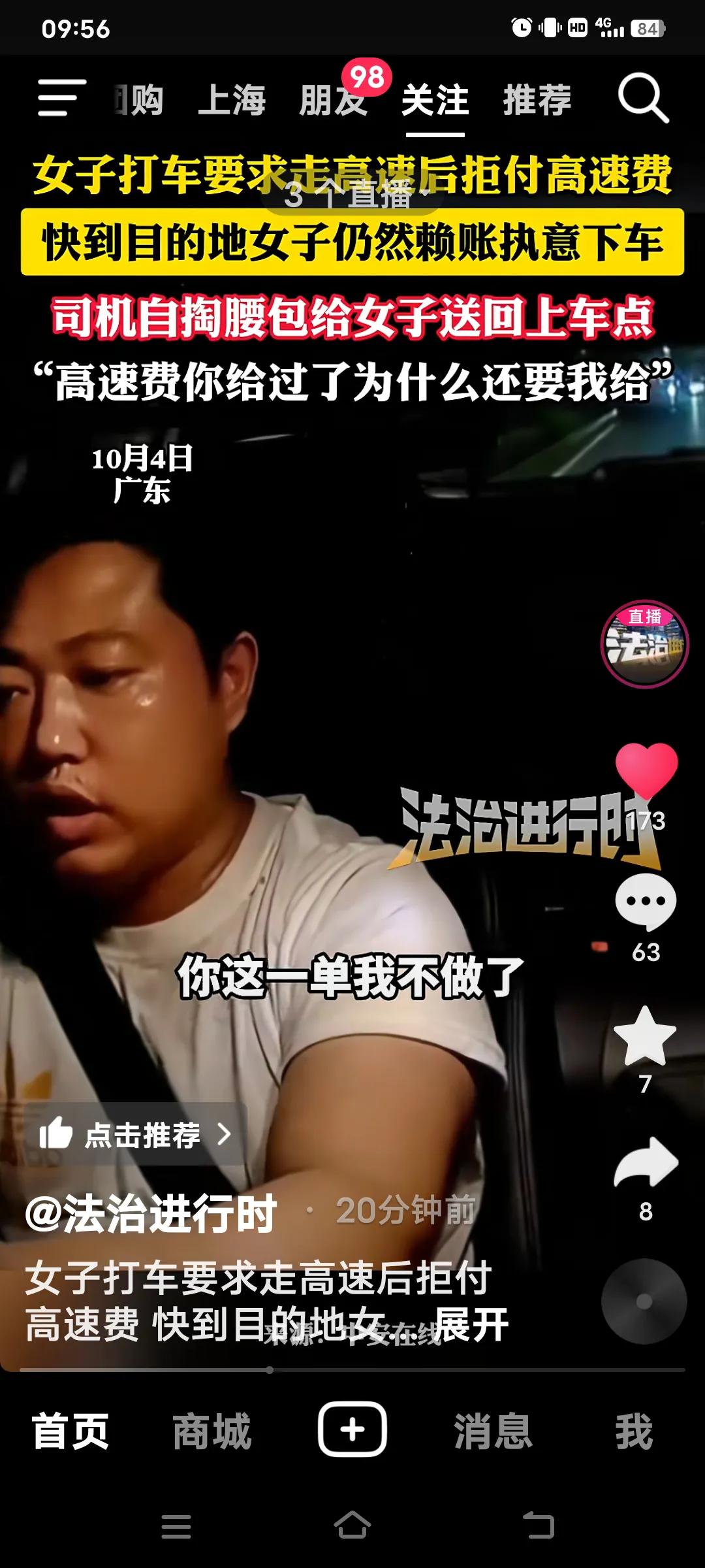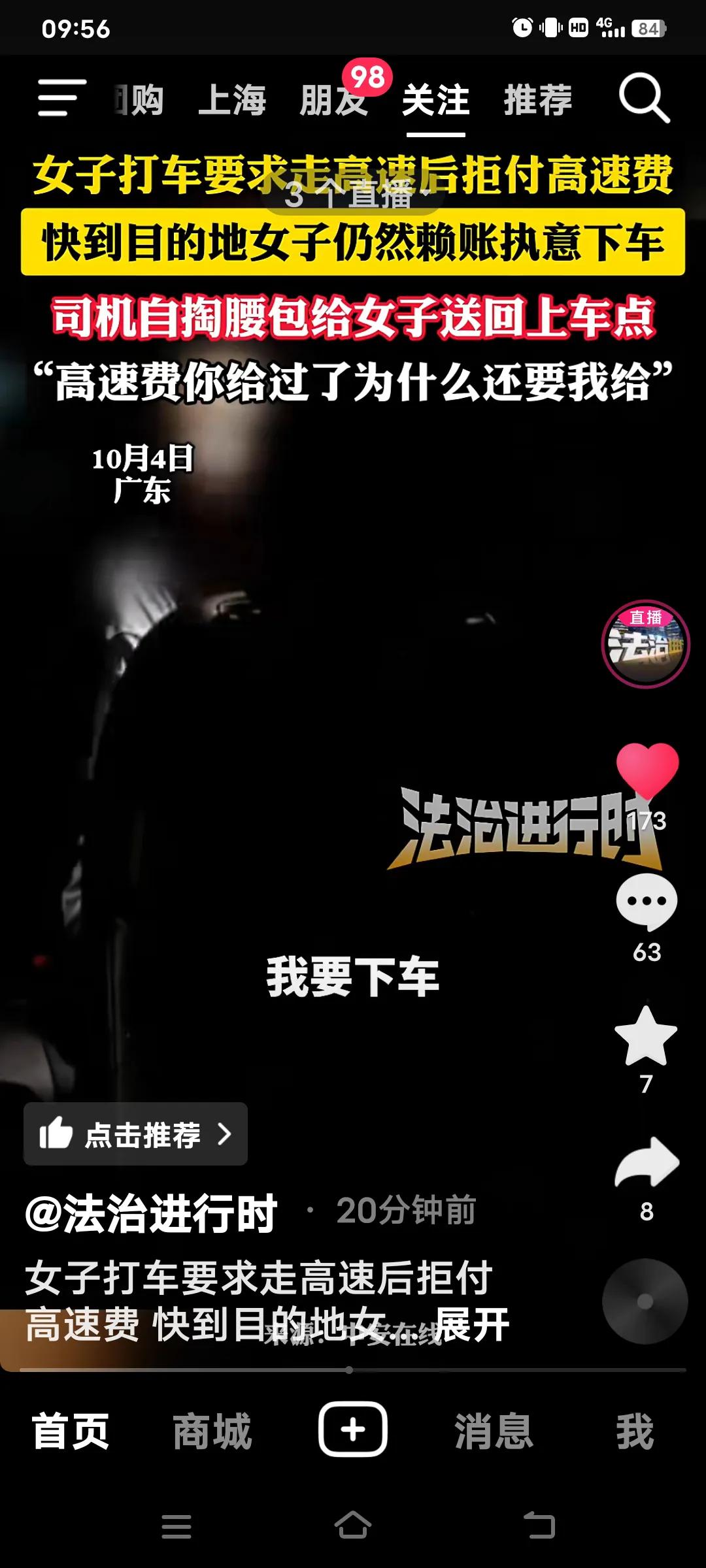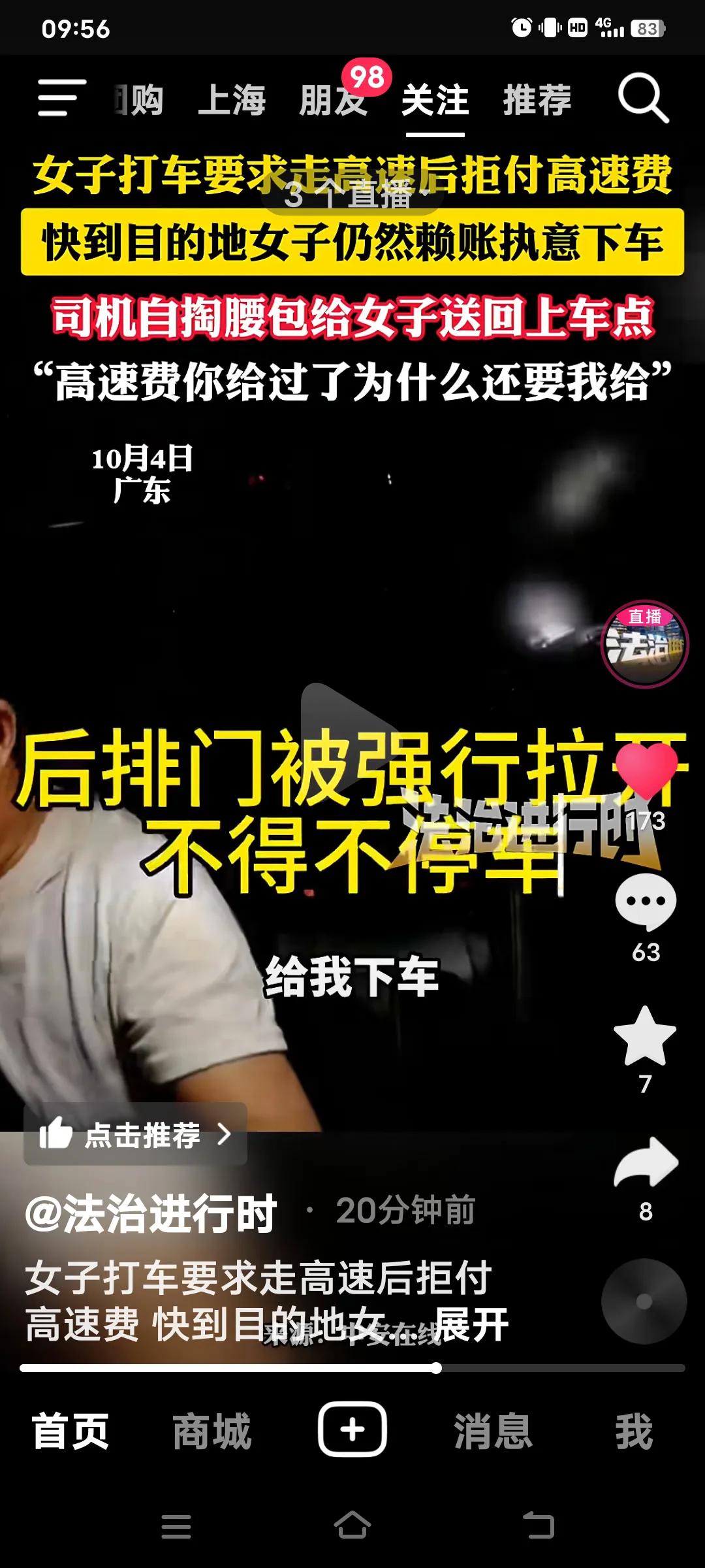 10月4日,广东一位女子打车时要求走高速,司机让她支付高速费,她却说道:“我凭什