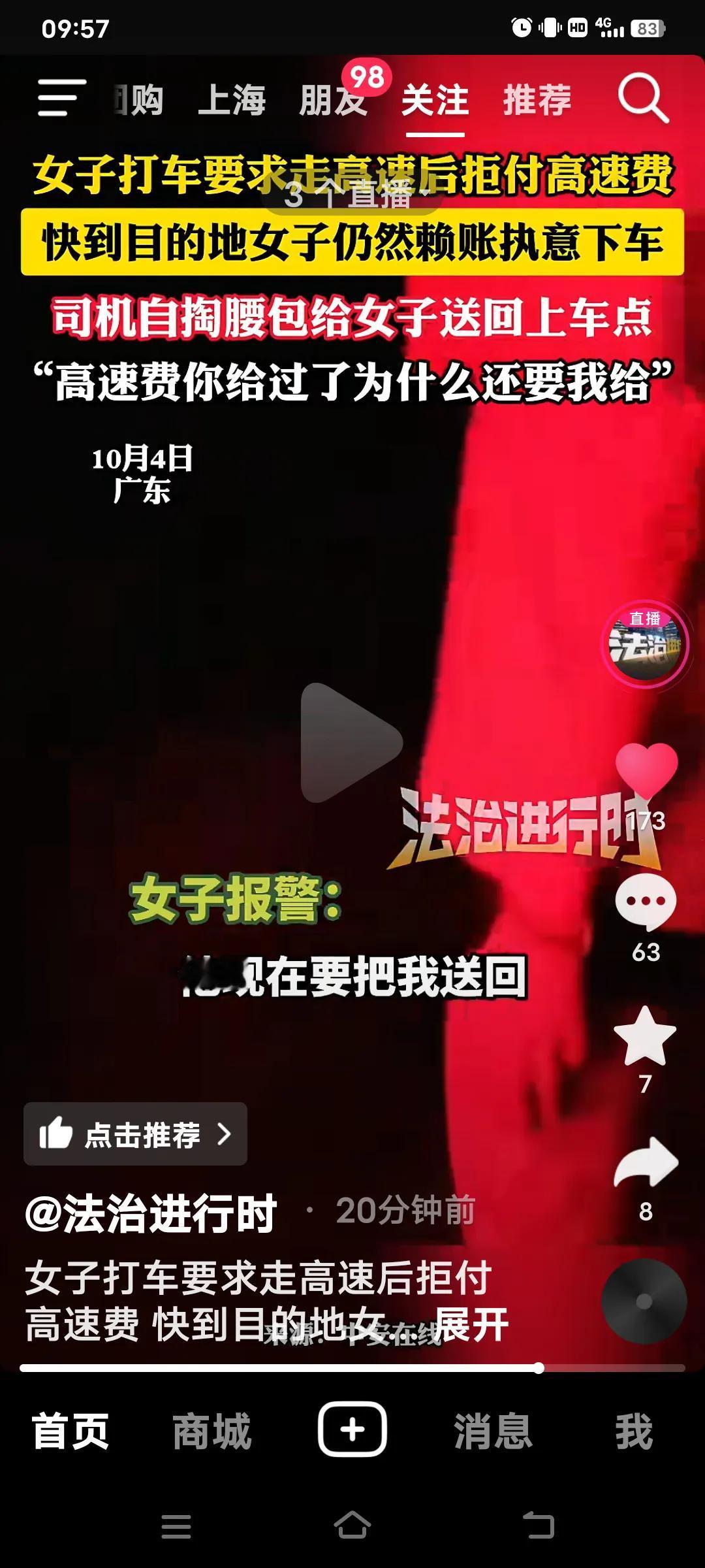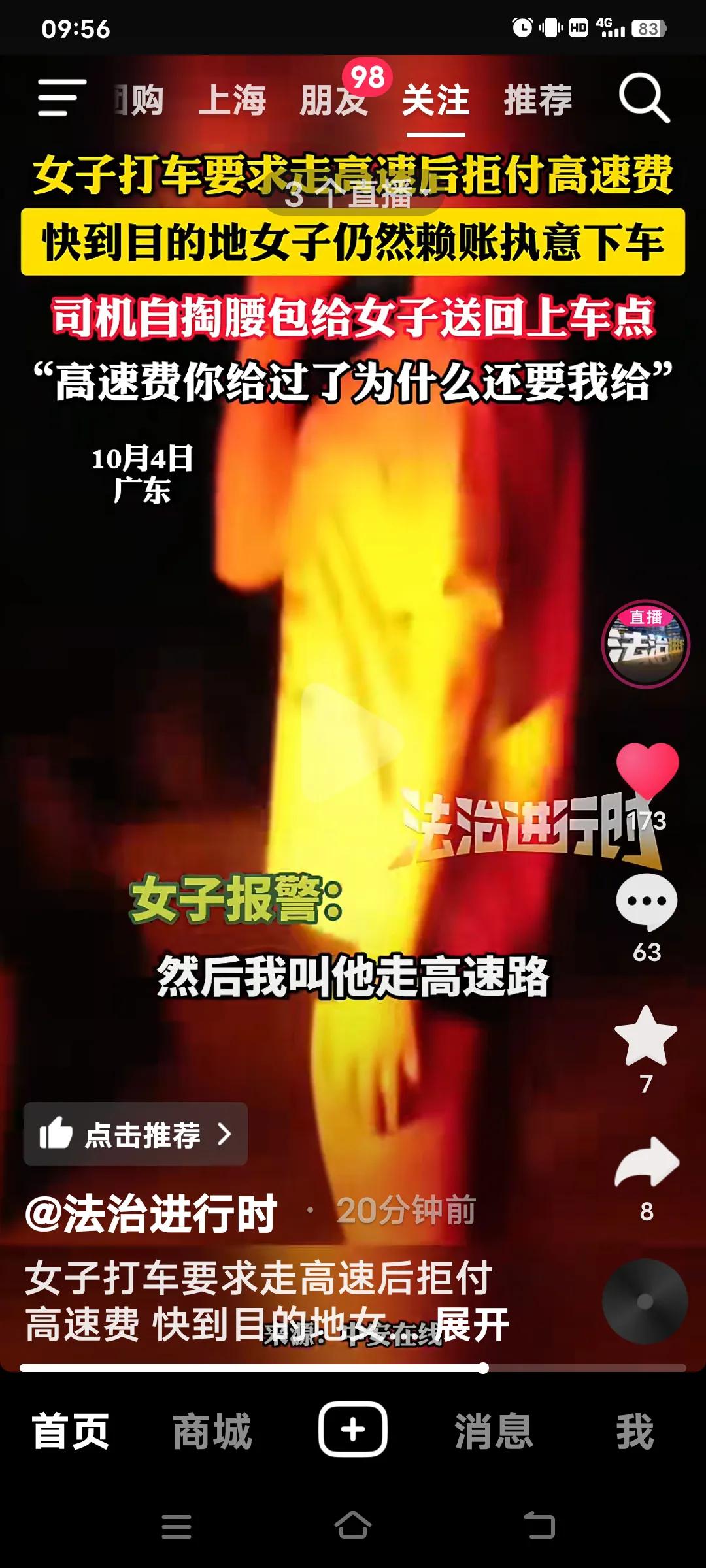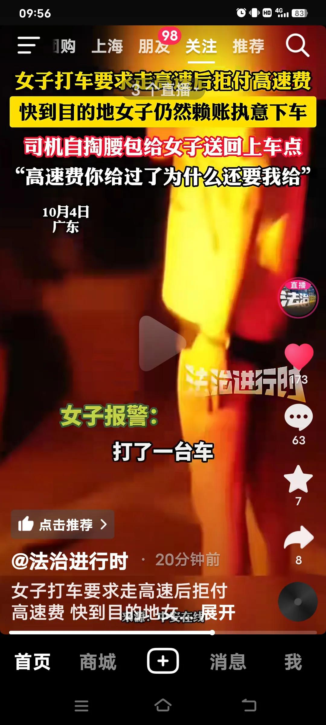 10月4日,广东一位女子打车时要求走高速,司机让她支付高速费,她却说道:“我凭什
