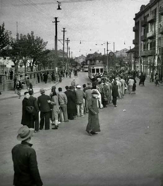 20世纪40年代的上海街头,一条马路上排起了长长的队伍,全是等着搭乘有轨电车的百