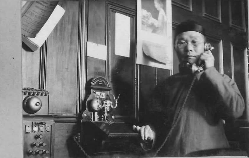 照片中的男子身着长衫,头戴传统瓜皮帽,正专注地手持老式电话机的听筒,似在认真通话。在电话技术尚属“新式事物”的年代,能在这样的环境中操作通讯设备,他大概率属于当时从事文职或技术类工作的“白领”群体,是近代社会里接触先进文明与技术的一份子。