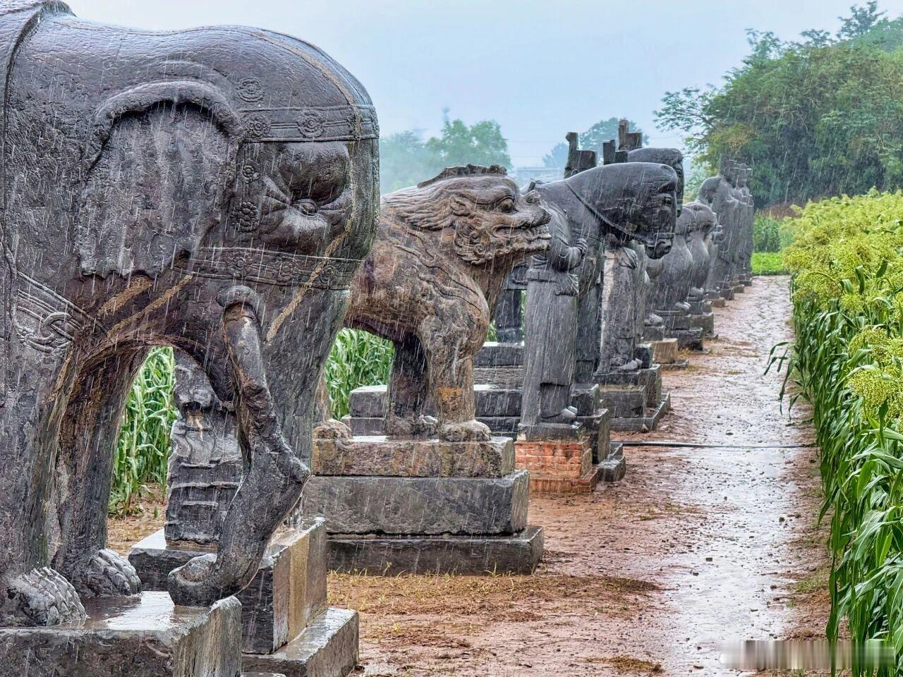 雨天的北宋皇陵,烟雨蒙蒙,山水如墨染。雨水顺着神道石像生的铠甲滑落,仿佛能让人看到大宋的风云在眼前流转。