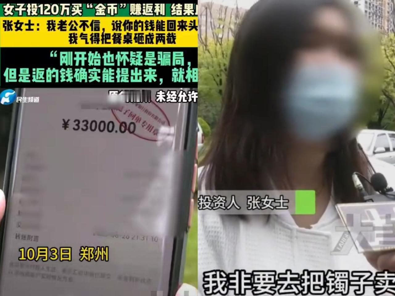 女子为投“金币”砸断餐桌, 120万打水漂以后才知道, 老公的“反对”才是真保护! 河南张女士被十几年的朋友拉去投“金币”,老公说这是骗局不让投,她直接把餐桌砸成两截逼同意。 刚开始确实能提现收益,她越投越猛,前后砸了120万进去。结果9月底平台突然崩了,APP打不开,钱全没了,她天天以泪洗面。 最戳人的是,老公不仅没骂她,还说“钱没了再赚,别搞坏身体”。 这哪是普通的投资坑啊?是“高回报”的糖衣裹着毒,更是人被贪心冲昏头时,听不进身边人的劝。 很多骗局都先给点小甜头,等你重仓就卷钱跑路。你身边有没有人差点栽进这种“高回报”陷阱?投资8亿打水漂
