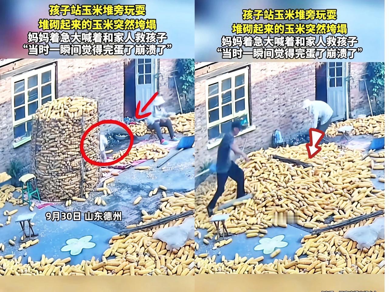 没想到晒个玉米也能出这么大的事! 山东德州,一岁多的娃在玉米仓旁边玩,好好的玉米堆突然就塌了,瞬间把孩子埋得看不见影! 孩子妈当场就崩溃喊哑了嗓子,一家子手忙脚乱扒玉米,万幸最后把哇哇哭的娃救出来了,身上连点皮外伤都没有。 别再说“有惊无险”了,这事真不是运气好!有懂行的网友戳破了,根本不是玉米堆自己塌,是装玉米的网子缆绳不结实,被玉米穗给撑断了才摊的。 说到底,还是大人一开始就没当回事——要么是缆绳没拴牢,要么是看着孩子在危险边上玩没及时拉走,总觉得“没事,就一会儿”,可危险哪会等你“一会儿”? 很多人觉得农村院子里都是安全的,玉米仓、柴火堆、农具旁,随手就让孩子自己玩。 这就是大人马马乎乎!一开始就是弄的不结实!还好孩子没事,提醒家长要好好看好孩子。玉米地悲剧 玉米晾晒