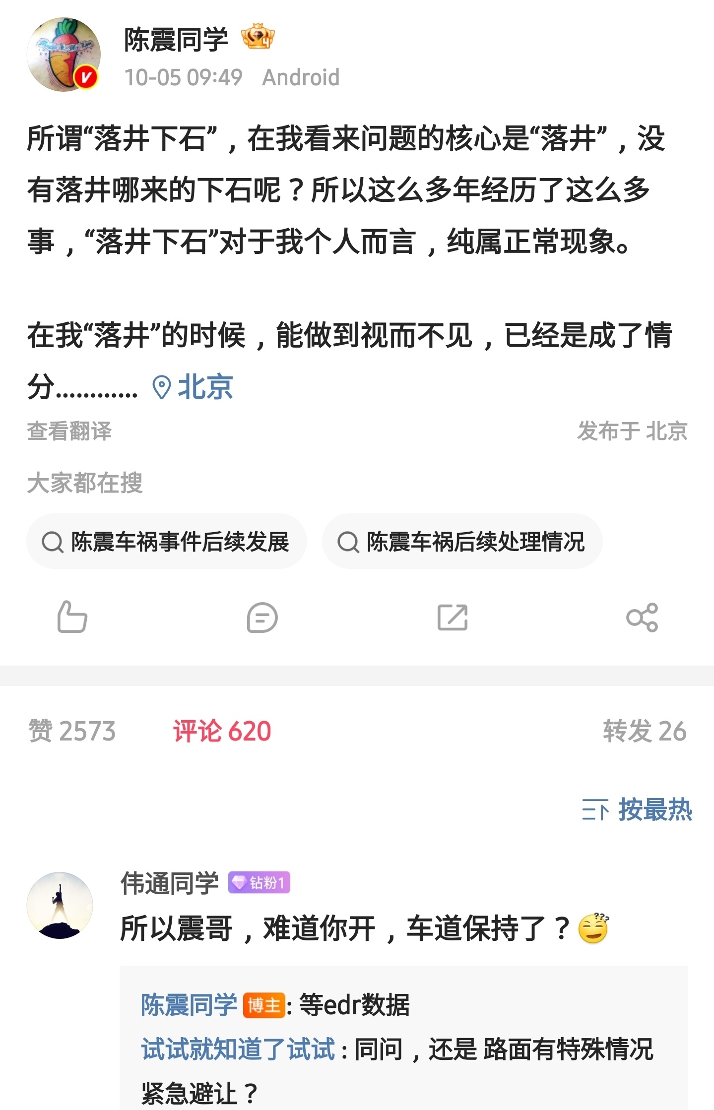 车评人陈震出车祸这事,同行竞争关系最激烈的韩路居然在自己账号上一点都没讨论,甚至连关注都没关注。