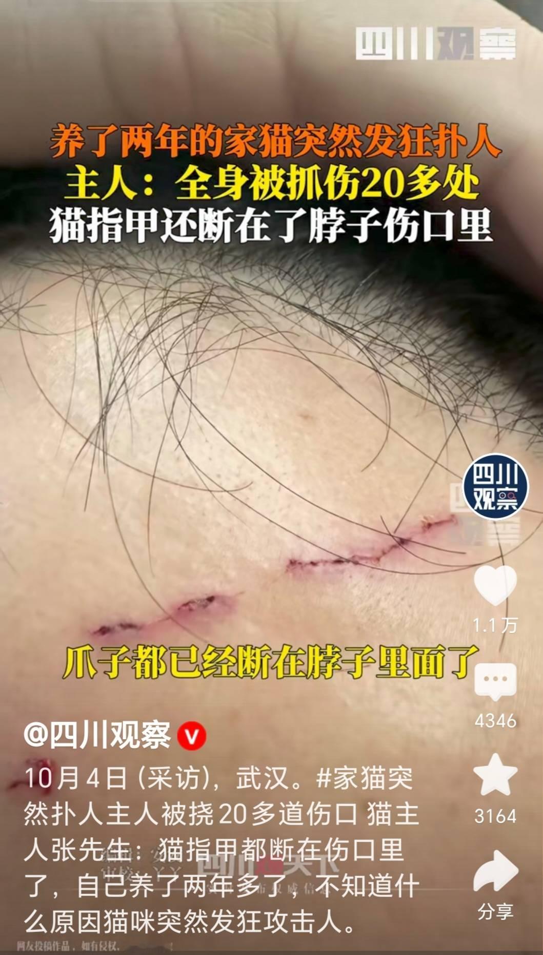武汉张先生养了两年多的家猫突然发狂,扑上来把他挠出20多道伤口,猫指甲甚至断在伤