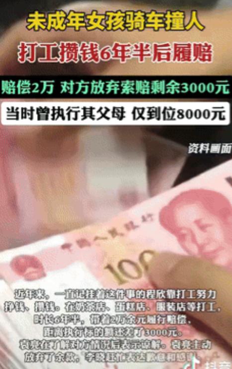 “鼻子酸了!”浙江,14岁的女孩骑电动车撞到了一名男子,需要赔偿31000块,然而女孩的父母各自再婚,能力有限只赔偿了8000块,岂料,女孩并没有忘记这件事,6年多时间拼命打工,最终存了2万块钱还给了男子,对方心里很感动,虽然还少了3000块,但最终选择不再追究,网友:一直都没忘记还钱,已经很不错了,见过太多借钱不还的! 小程,那年仅14岁,还是初中生,家境并不宽裕。父母早年离异,各自再婚,生活中她一直缺少稳定的家庭依靠。 那天,她骑着家里仅有的一辆电动车,刚从学校回家,路上急着穿过马路,却不料与一名男子袁某发生了碰撞。 刹那间,尖锐的摩擦声、碰撞声和男子痛苦的呼喊声在她耳边响起,小程被吓得脸色煞白,整个人僵在原地,手里紧握的车把微微发抖。 事故后,袁某被送往医院,经诊断需要进行手术和长时间康复治疗,医药费共计31000元。 交警判定小程负全责,她心里明白,这不仅仅是一次意外,更意味着她将承担巨额的赔偿。 小程的父母各自再婚,经济条件有限,面对这样一笔费用,双方都明确表示无力承担,最后只支付了8000元作为部分赔偿。 小程知道,这意味着她还欠袁某23000元,这个数字对她而言像座大山,沉重而无法逃避。 刚开始,14岁的小程内心充满了恐惧和无助。她无数次想象过袁某脸上的表情,想象过自己因意外带给他和家人的困扰与痛苦。 每次夜深人静,她都在脑海里反复计算着未来如何筹钱还清这笔债务。然而,她没有选择抱怨父母,也没有选择逃避,她告诉自己:“总有一天,我会把钱还给他。” 小程的青春岁月被一份责任感和自律感悄然塑造。初中毕业后,她没有选择继续升学,而是开始打零工、兼职,从最基础的餐馆服务员做起,接着在工厂、超市、外卖配送等岗位轮流尝试。 每一次打工,她都尽量节省开支,把每一分钱都存进自己暗中设立的小本子里。即便同龄人花钱买零食、买衣服,她也从不动摇自己的原则。 六年的时间,她经历了无数次劳累的夜晚,也忍受过同伴的不理解和调侃:“人家又没找你要?” 终于,、小程拿着整齐叠好的2万元现金,站在袁某家门口,敲响了那扇门。 袁某开门的那一刻,还未完全认出面前的女孩,眼神里多了几分疑惑与惊讶。小程低声说道:“这是我这几年存下来的钱,想把当年欠您的医药费还给您。” 袁某愣了愣,眼眶微微湿润。2万元虽然仍差3000元,但他能从这份真诚和坚毅中感受到女孩心中的责任与成长。 他握住小程的手,哽咽着说:“没关系,你已经做得很好了,我不再追究剩下的钱。” 新闻报道曝光后,网友纷纷感叹:在这个时代,见过太多借钱不还的人,而小程却用六年的时间兑现承诺,让人敬佩。 有人留言说:“她的坚持和责任心,已经比很多成年人都令人动容了。”还有人感叹:“社会上总有太多逃避责任的人,而她用行动告诉我们,诚信和坚守是多么宝贵。”