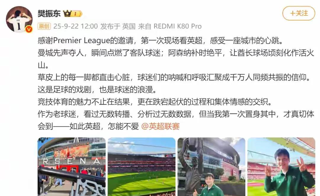 樊振东嘴一开,C罗的名人堂票数直接飙上天。 他不是球迷,是流量发动机。 萨尔布吕肯的球场,中国球迷挤满看台,德国人愣是没搞懂为啥乒乓球冠军一开口,连第四级联赛都火出圈。 C罗微博回他“小胖,继续夺冠”,那不是客套,是顶流认了顶流。 英超改规则了,全球影响力占25%——C罗的抖音粉丝比某些国家人口还多,樊振东一句话,几十万中国网友点开投票链接,像刷直播间礼物一样干脆。 没人逼他站队,但他站了,还站得比谁都响。 不是预言,是共振。 一个打乒乓球的,把足球的票,从欧洲拉到了亚洲。 萨尔布吕肯的“FAN Arena”牌匾,挂的不是名字,是跨界破圈的硬通货。