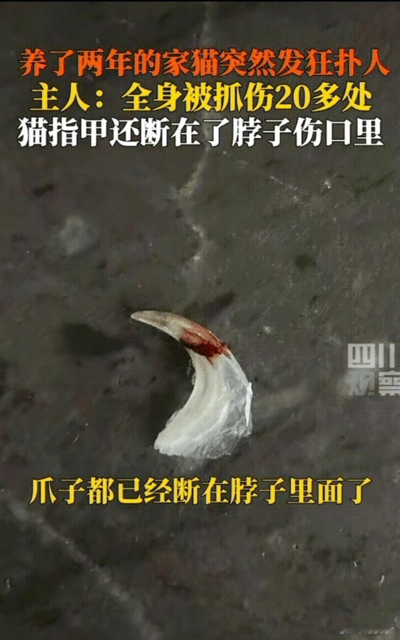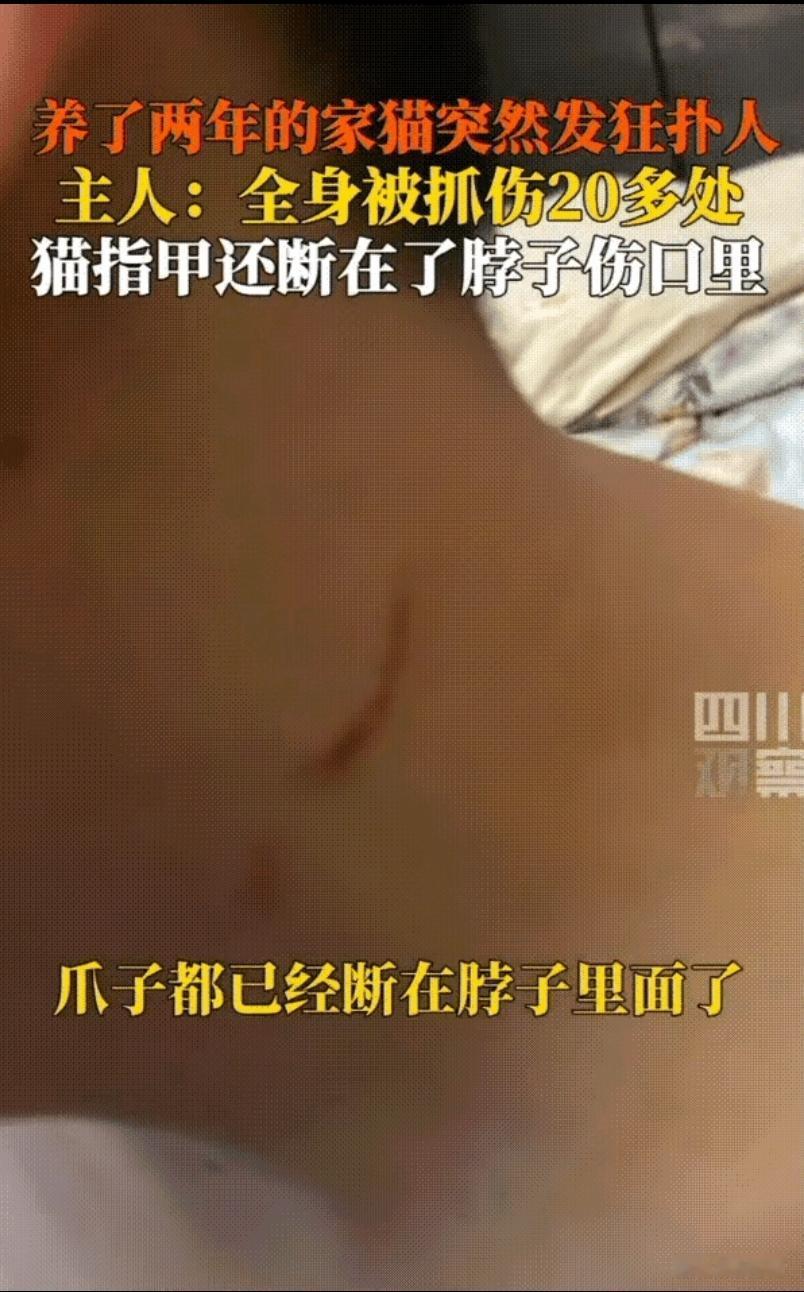 太让人寒心了! 武汉,一男子闲来无事,蹲地上逗自己家猫,没想到,猫却突然扑了他一下,直接让男子懵了,结果下一秒直接被抓了个正着,猫咪攻击了男子2分钟,导致男子全身被抓了20多道伤口,就连猫指甲都断在脖子伤口里,男子很不解:自己养2年多了,为什么猫咪会突然发狂攻击人? 有网友评论: 此次伤人事件严重,放生是对潜在危险的预防 此猫性格钢烈,不喜欢人类自认为的爱的撫摸。养猫养狗前多想想,规避风险。[大笑] 之前被虐杀的三只小猫的妈妈要是有这样的攻击力也不至于让小恶魔得逞[发怒] 确实让人很寒心,养了两年真的是白养了,建议赶紧放生吧,养也是养不熟。 对此,大家觉得猫发狂是因为什么呢?