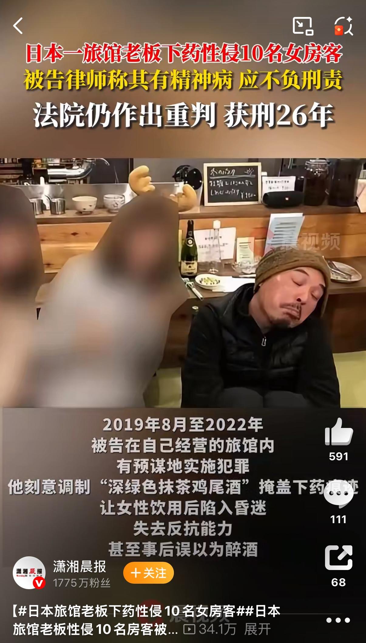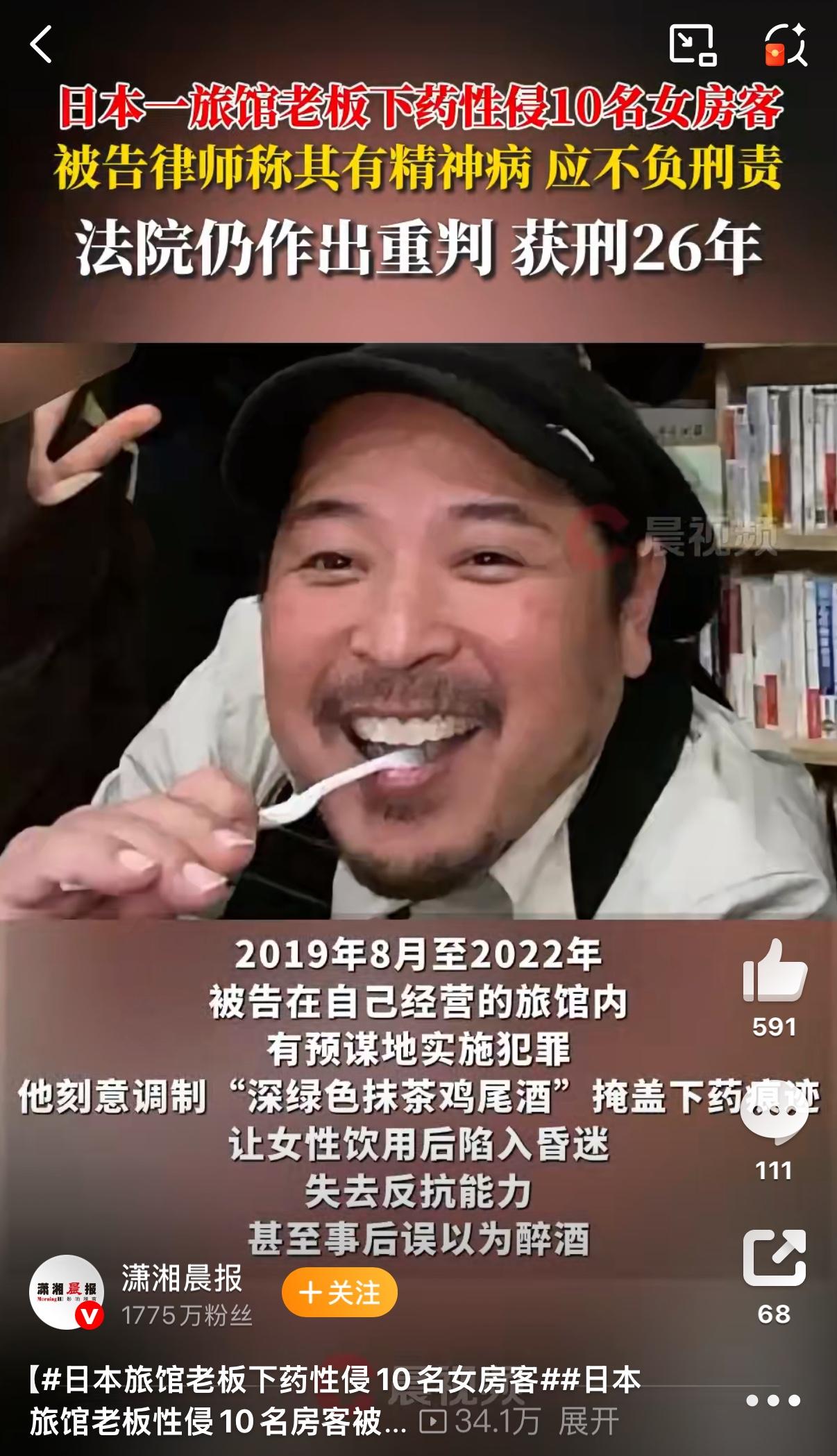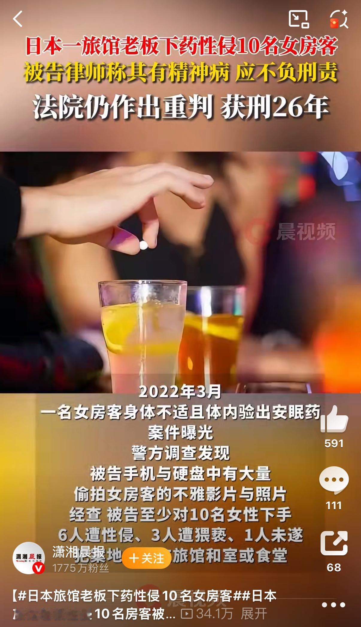 一杯“特色抹茶鸡尾酒”竟藏着四年的噩梦,日本那个旅馆老板的操作简直让人后脊发凉。 这事说出来都让人头皮发麻,51岁的旅馆老板看着挺热情,却在自己的店里干着龌龊事。他专门给单独入住的女房客调深绿色的抹茶鸡尾酒,其实里面加了安眠药,就为了掩盖药物颜色。女房客喝下去很快断片,醒来只觉得累,还以为是自己喝醉了,根本想不起发生过什么。直到有个房客身体不舒服去检查,查出体内有安眠药残留报警,这桩持续四年的罪恶才被揭开。警察一查更震惊,他手机和硬盘里全是偷拍的不雅视频,还按受害者名字分了类,光是确认的受害者就有10个,6人被性侵,3人遭猥亵,还有1人未遂。 最让人愤怒的不是作案手法多隐蔽,而是这老板的嚣张和冷血。被捕后面对记者居然还竖大拇指,一点悔意都没有,庭审时律师还拿“精神疾病”当借口想脱罪,还好法官没信,说他作案条理清晰,明显是有预谋的理性犯罪。可最终判了26年,还是让好多人觉得不解气,有人算过,平均到每个受害者头上才2.6年,这惩罚真能抵得上她们一辈子的心理创伤吗? 更细思极恐的是,这事能藏四年,全靠“信任”两个字。出门在外,谁会对旅馆老板递来的“特色饮品”有那么强的戒心?那些受害者说不定一开始还觉得老板人挺好,殊不知自己一步步走进了陷阱。这哪是旅馆啊,分明是他精心布置的犯罪舞台。而且要是没有那个坚持去做检查的房客,不知道还有多少人要遭殃。 这事儿也给所有人敲了警钟,所谓的“善意”真得多留个心眼。别说是陌生人给的吃喝,就算是看着“靠谱”的店家、熟人递来的东西,也得绷紧安全这根弦。毕竟你永远不知道,笑脸背后藏着的是真心还是恶意。更让人揪心的是那些受害者,好多人事后才知道自己遭了罪,有的搬了家,有的只能默默继续生活,就怕这事影响以后的日子。她们的创伤哪是罪犯坐牢就能抹平的? 26年的刑期或许是法律能给的交代,但对受害者来说,心里的疤可能一辈子都消不了。这案子也暴露了民宿行业的漏洞,要是早有监管,说不定能早点阻止这场噩梦。 想想我们出门旅行时,是不是也接过陌生人递的水、尝过店家推荐的“特色”?经过这事儿,你以后会更注意这些细节吗?或者你身边有过类似让人警醒的经历?来评论区聊聊吧。 来源:潇湘晨报