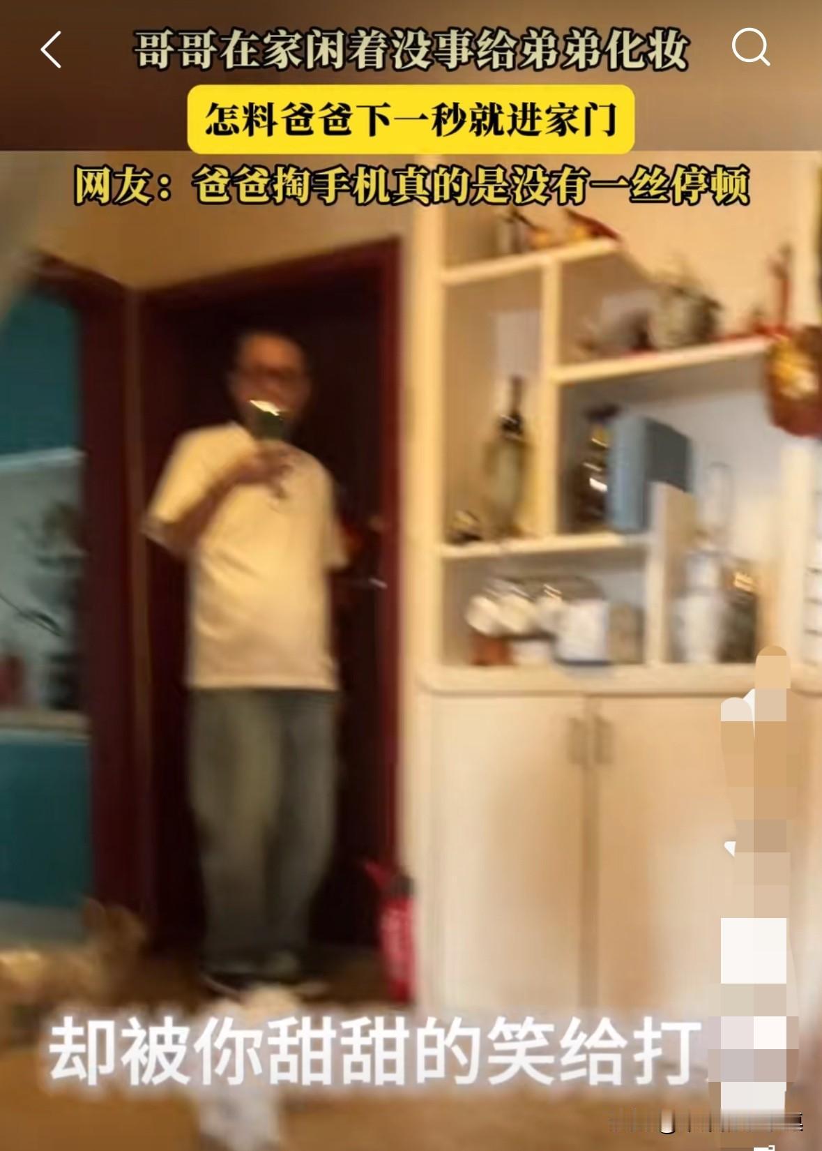 哥哥在家闲着无聊,给弟弟化女装,别说,弟弟扮上还真是惊艳。 两人正在兴致勃勃的拍照片,不料这时候爸爸回来了,两人躲闪不及。 爸爸刚进家门,第一时间掏出手机拍照。太喜欢这种不扫兴的家长了。 爸爸可能做梦都想要一个女儿吧,这下儿女双全了。男扮女装反串