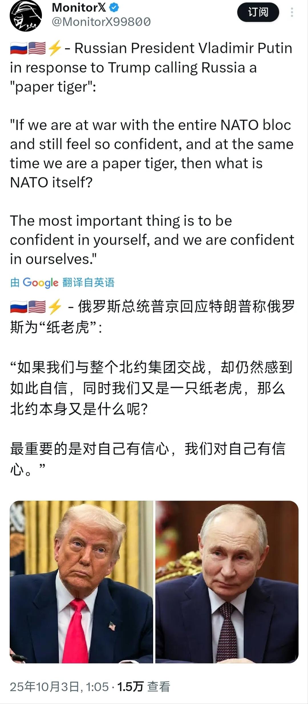 普京:俄罗斯是一只“纸老虎”,那么北约本身又是什么呢? 俄罗斯总统普京回应特朗
