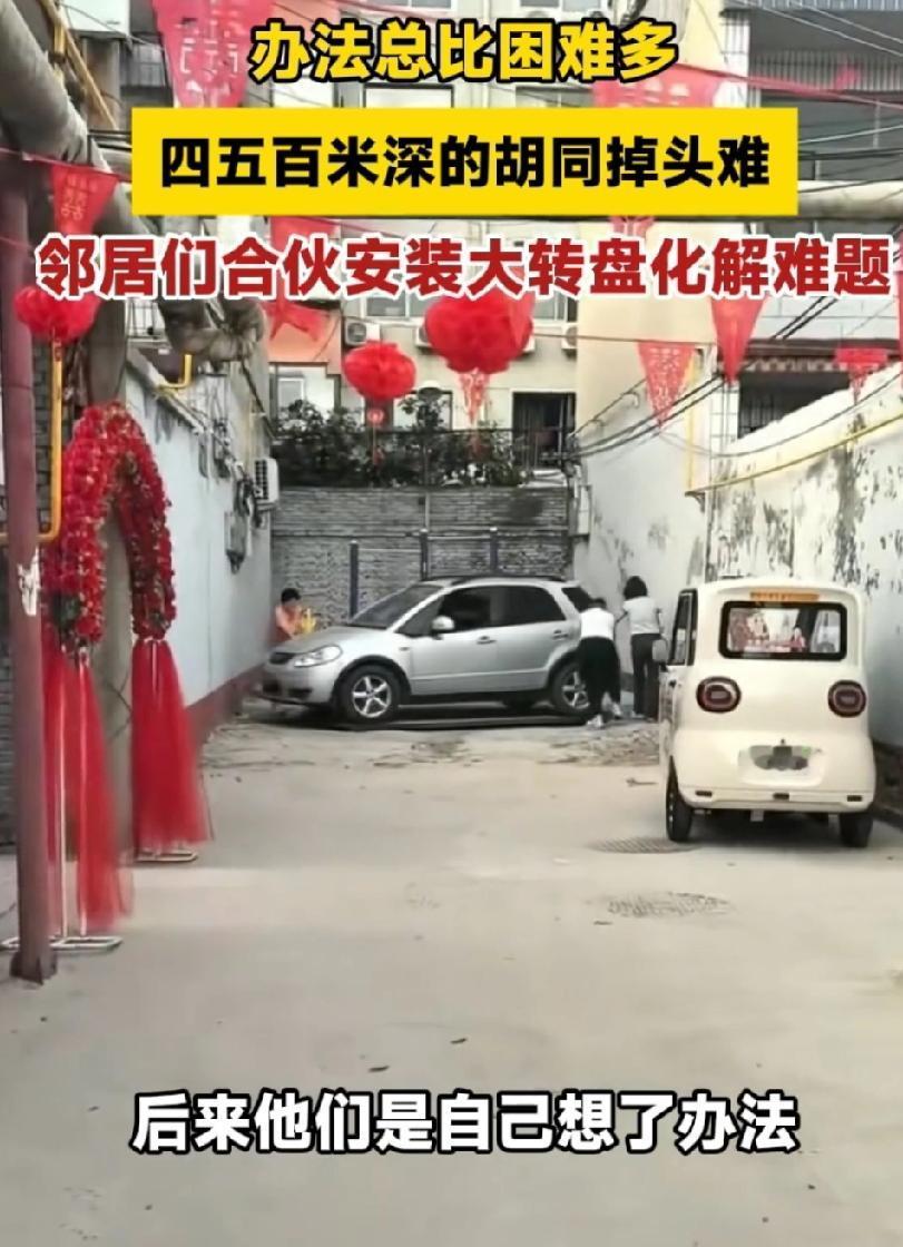 胡同里藏着“航母级”掉头神器?四五百米深的窄胡同 老司机都得倒几百米 居民自己凑钱造了个大转盘 开车上去推一把就转过来 太绝了! 这可不是瞎折腾,胡同宽才4米,常规掉头得三进两退,新手根本搞不定。有铁路工作的居民受集装箱转盘启发,牵头做了这个共享神器,花的钱不多,却解决了天天犯愁的麻烦。 比起花20万改车的“黑科技”,这才是真懂生活的智慧。高端技术再好,不如接地气的小发明管用。城市治理真该多看看这些民间巧思,比硬套方案实在多了。