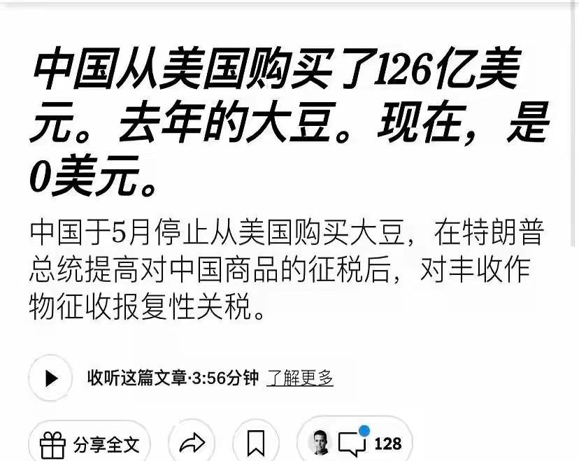 中国不买美国大豆,寝食难安,心急火燎的特朗普现在满脑子都是大豆! 中国去年从美国购买了126亿美元的大豆,而今年中国购买美国的大豆至今都是0。 美国要想中国采购美国的大豆,特朗普政府必须取消所有相关关税。否则再过段时间想让中国买,晚啦,中国已经买完所有需要的大豆。 现在,据内幕人士透露,特朗普放话希望中国给他面子,大力购买美国的大豆。 给他面子?特朗普真的幼稚。商人就是商人,你把关税加那么高,还天天打压中国,现在阿根廷、巴西的大豆都比你便宜,还好意思提出这个要求。