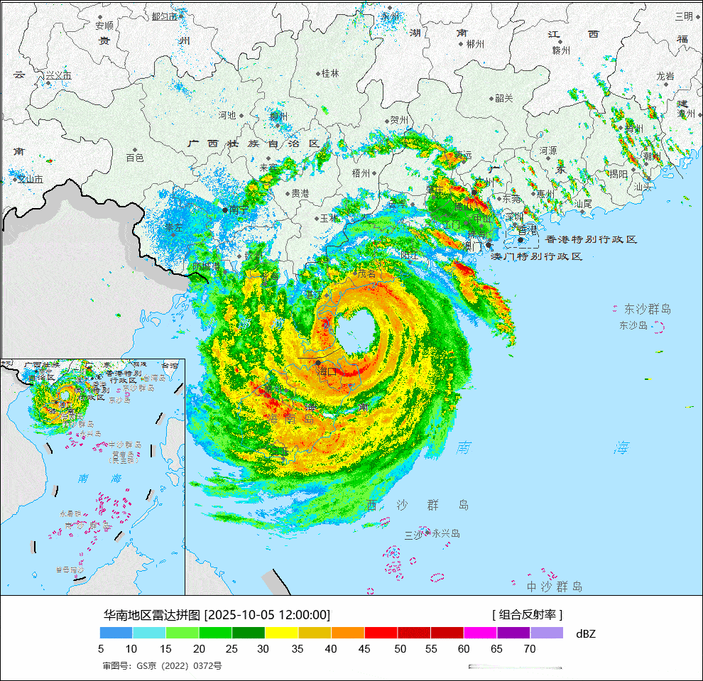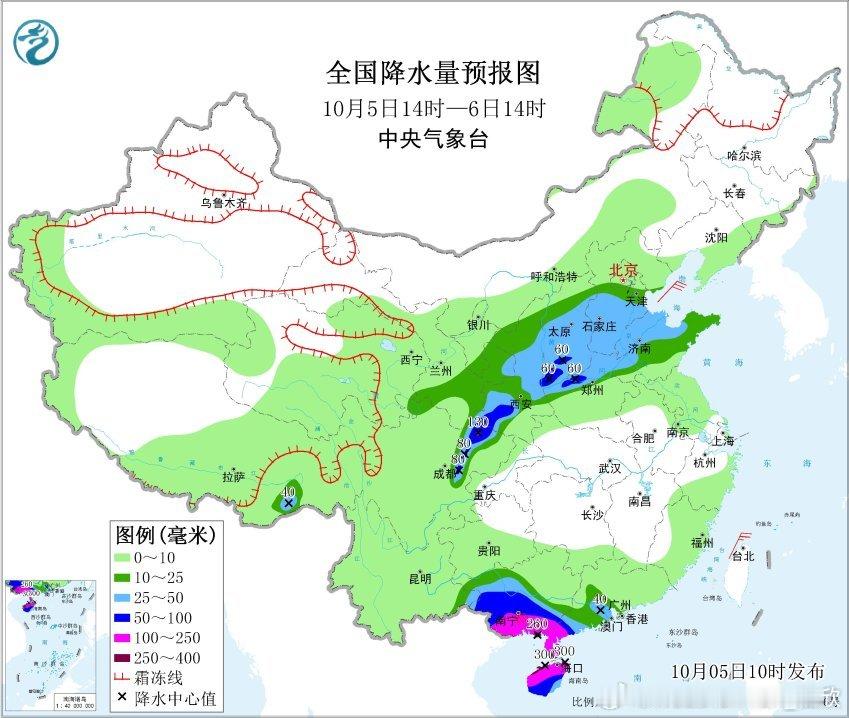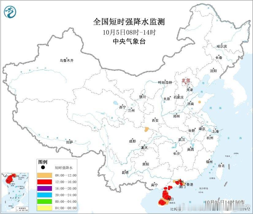 根据中央气象台发布的暴雨橙色预警:预计,10月5日14时至6日14时,海南岛、广东西南部、广西南部和西部等地部分地区有暴雨到大暴雨,局地特大暴雨(250~300毫米);此外,四川盆地中部和北部、陕西中部和南部、山西中南部、河北中南部、山东北部、河南北部等地的部分地区有大到暴雨,四川盆地北部局地有大暴雨(100~130毫米);