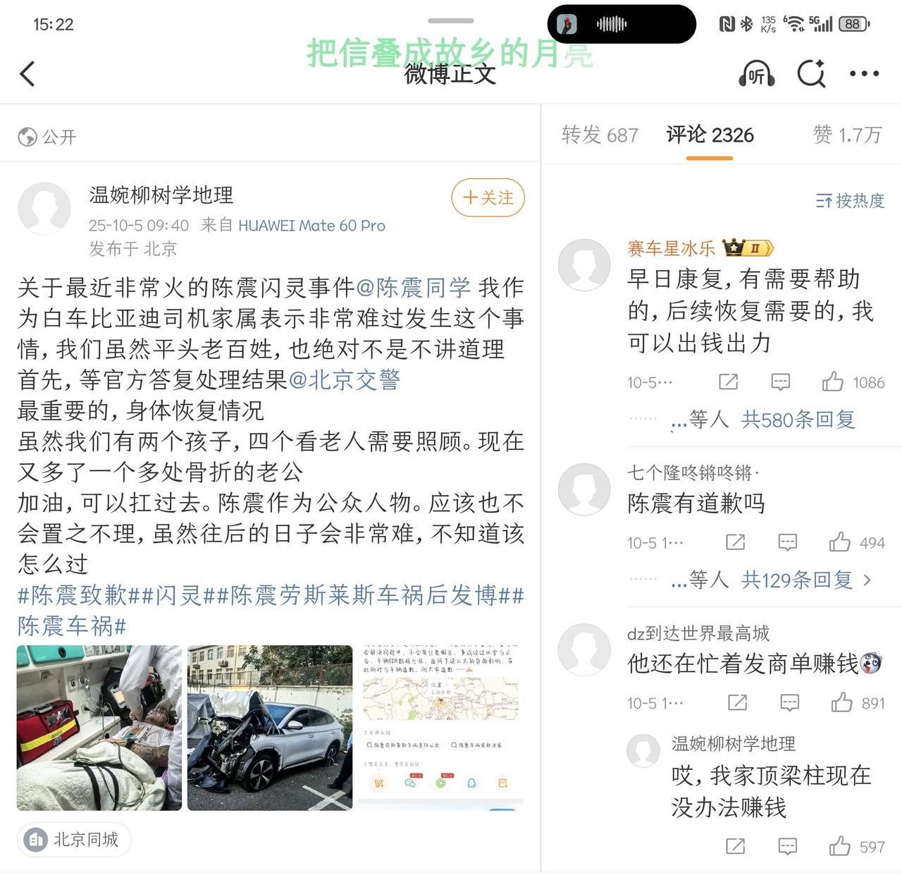 陈震首次向被撞司机家属致歉! 这个时候,补偿也好赔偿也罢,钱都有了具象化的意义,这起事件中的不幸之万幸,陈震刚好有钱,而且也没有赖账前科,有能力担责,要是真点背碰到个上头黄毛,连车是分期贷款买的,父母也是普通人没什么钱,那才叫绝望,哪怕申请强执都无济于事。 最后希望大家都文明驾驶,希望被撞司机早日康复[祈祷]