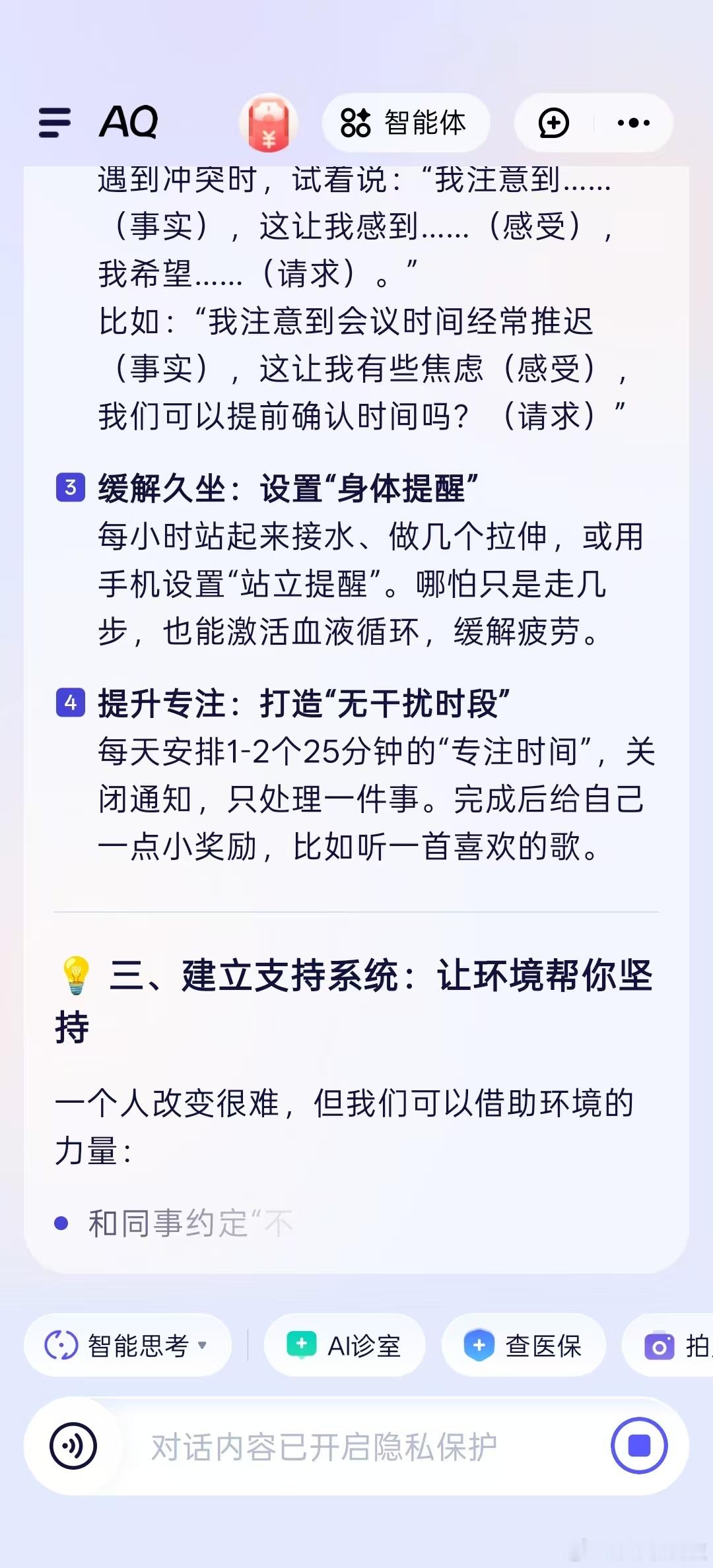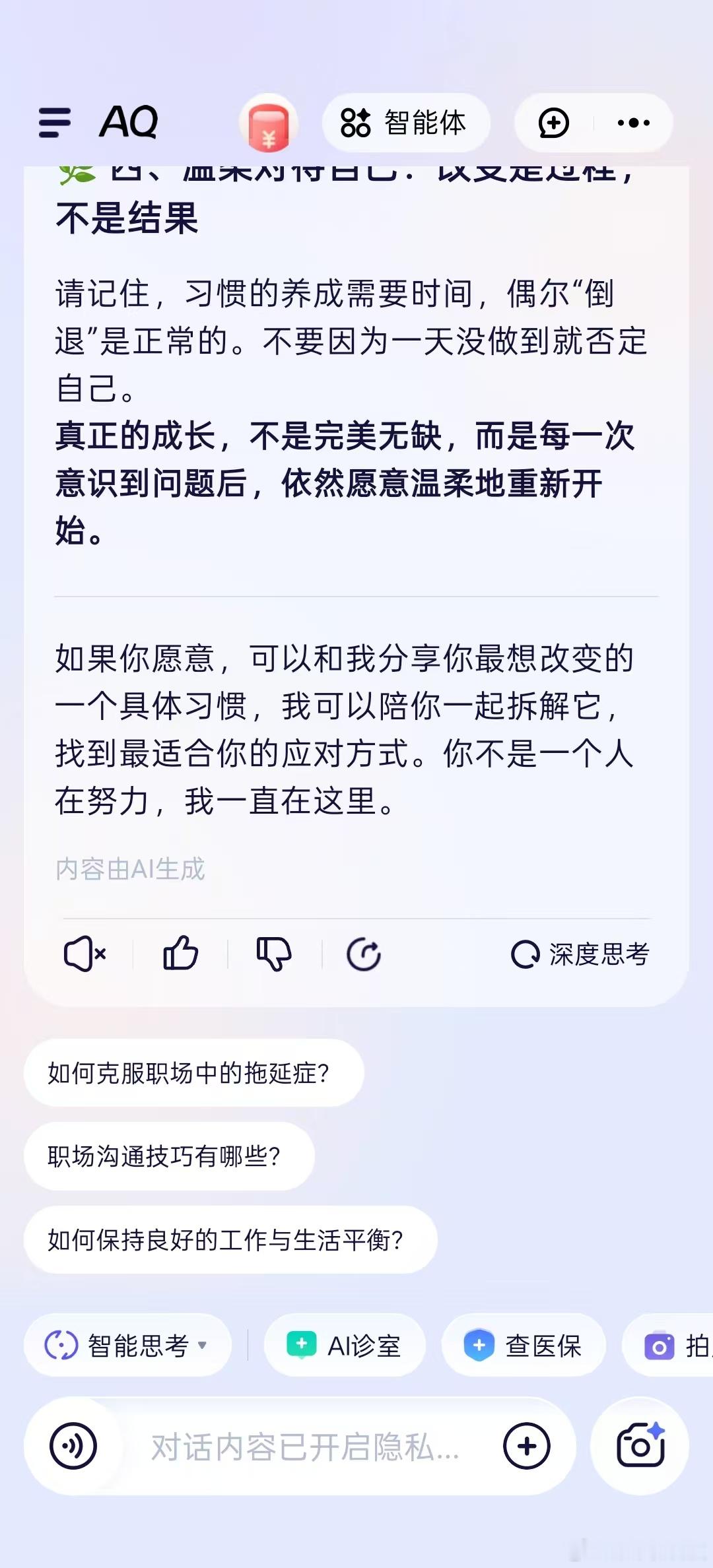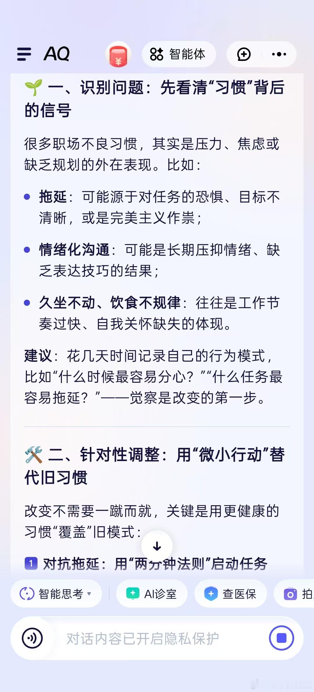 十一旅游必备健康搭子平时办公室久坐一身“班味儿”,颈椎腰椎轮番抗议,就指望国庆出去浪回血。但“脆皮”体质真顶不住特种兵式旅游,去年我就吃过亏,水土不服加上玩嗨了忘记吃药,导致半个假期都在硬撑。所以今年我的旅游必备是AI健康管家AQ。它不仅能像私人闹钟一样准时提醒我吃药,还能在我面对陌生美食或突发小状况时,提供基于权威知识的靠谱建议。健康的身体才是享受风景的前提,带上这个智能搭子,才能玩得真安心。