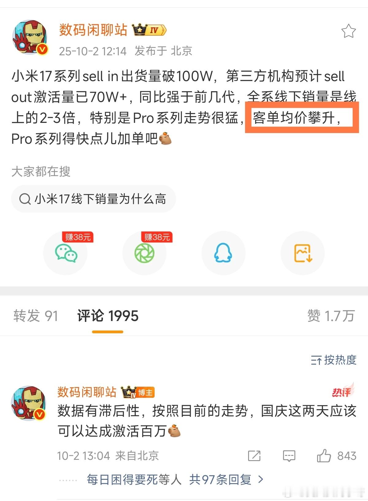 知名爆料博主站哥已确定,小米17系列目前总激活量已经达到100万!!并且5k~7k价位段的17pro系列占激活大头,今年确实还挺狠的……[酷][酷][酷]