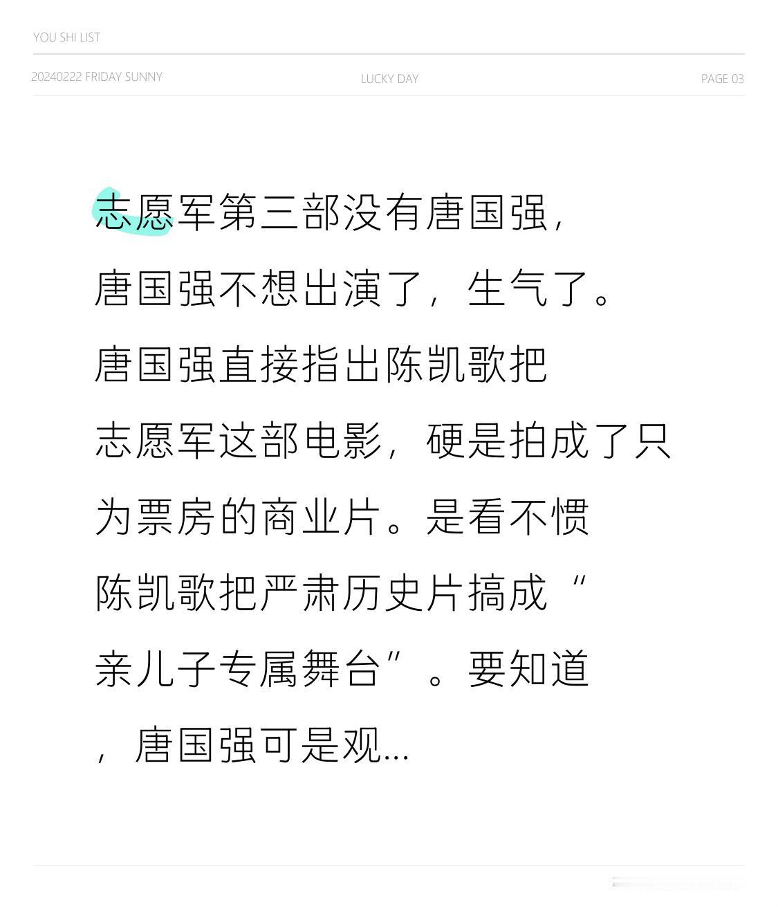 志愿军第三部没有唐国强,是因为他不想出演,还为此生了气。 唐国强直接指出,陈凯歌把《志愿军》这部电影硬生生拍成了只为追求票房的商业片。 他看不惯陈凯歌把严肃的历史片搞成了“亲儿子专属舞台”。 要知道,唐国强在观众心中可是“特型演员”的典范,从诸葛亮到伟人形象,他所塑造的角色都自带厚重感。 这次他毫不隐晦地吐槽,称陈凯歌将电影拍成了只为圈钱的商业片,一边删减他的戏份,一边硬塞进陈飞宇,还找来一堆偶像演员充数。 甚至连虚拟人物都敢加入历史情节,这哪里是在致敬先烈,分明是把历史情怀当作垫脚石,为自家儿子铺就星途。 《霸王别姬》的辉煌早已成为过去,如今的陈凯歌,眼中只剩下票房和儿子的流量。 这样的电影,我选择不看,不会为这种拿情怀换票房、拿历史捧儿子的行为埋单。 唐国强 志愿军3 唐国强演技 钢铁意志志愿军 唐国强手稿