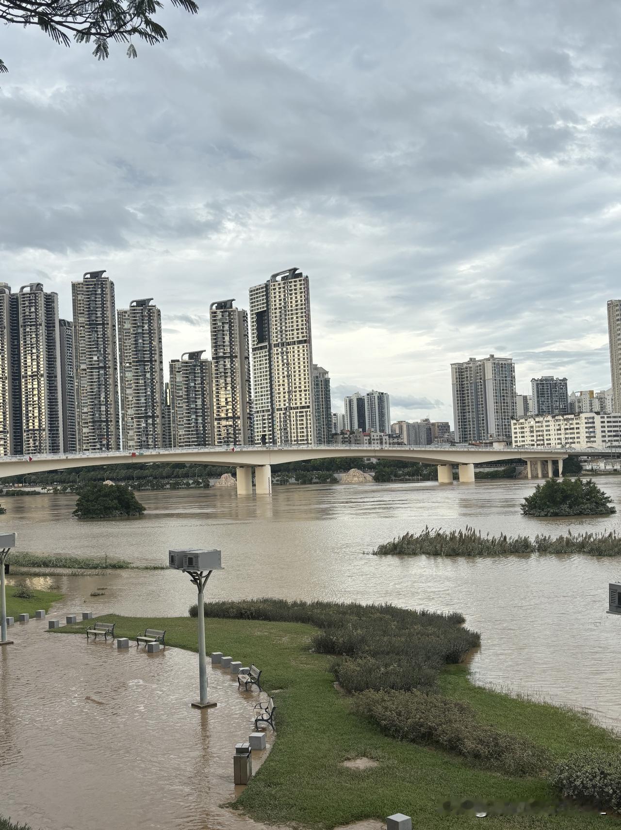 广西这洪水来得有点猛! 平时在亭子码头遛弯儿、跳广场舞多热闹,现在直接变成"水上乐园"了——长椅都快被淹到椅背上了,路灯杆都能当潜水杆使了! 江水浑得跟泥汤子似的,流速快得能跑船。 30度的天气,我和你说我们这里有洪水,你可能都不相信。 你们家那边没受影响吧? 听说今晚还有暴雨,大家出门可得小心点!