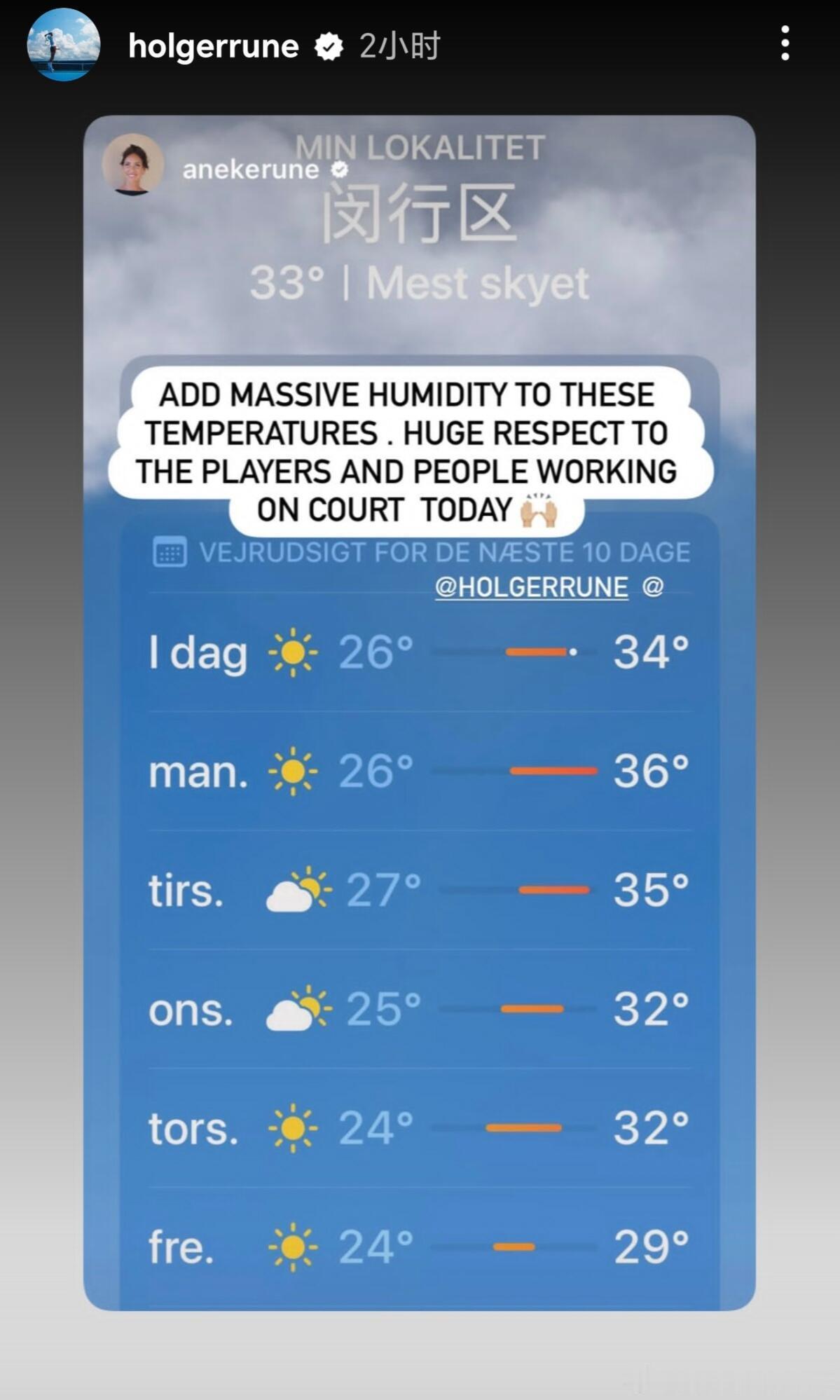 据sportskeeda报道,在上海大师赛期间,球员们持续遭遇极端天气条件。丹麦球员霍尔格·鲁内对ATP未启用高温规则表示担忧。