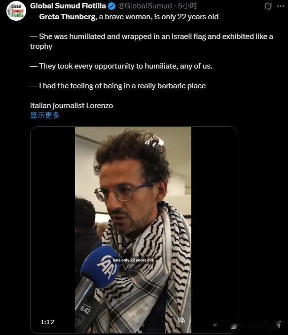 她被拖下船,国旗塞进手里,全世界却装没看见 10月1日,一支叫“全球苏穆德船队”的救援船队在海上被以色列军队拦下,四十多条船,四百五十多人,来自四十四个国家,他们从西班牙出发,打算给加沙送吃的、喝的、药,刚进国际水域,以军就登船,把所有人抓走,大多数人被关进一个叫“凯齐奥特”的沙漠监狱,那地方专门关巴勒斯坦政治犯。 三天后,一百三十七个被放出来的人在伊斯坦布尔开了发布会,他们跟CNN、TRT这些媒体说了自己的经历,有人被脱光衣服搜身,连牙齿缝都翻了一遍,有人戴塑料手铐站了十六个小时,十四个人分一盘饭,喝水得去马桶龙头接,睡觉总被吵醒,不少人身上起了疹子,嘴里干得厉害,最让人想不到的是,环保少女格蕾塔·通贝里也被打了,头发被人拽,还被逼着亲以色列国旗,最后裹着旗子拍了照,瑞典外交部后来发邮件确认,她确实被逼着举过那面旗。 格蕾塔还没放出来,二十二岁,关在满地臭虫的牢房里,吃不饱,喝不上水,连水都难咽,她不肯签以色列给的文件,那件写着“去殖民化”的T恤,被人转来转去,这也不是她第一次被抓,今年六月,以军就抓过她一次,故意不让她睡,明摆着冲她来,她早就是以色列官方用来压反以声音的靶子。 以色列内政部长本-格维尔亲自去监狱看热闹,站在那儿说他们是恐怖分子,结果囚犯们一起回骂,说你们才是恐怖分子,场面一下子乱了,他只好灰溜溜走掉,这可不是偶然,以色列政府一直把任何帮加沙的事都叫支持恐怖主义,拿法律当借口,干着暴力的事。 欧洲那边闹起来了,意大利三十万人上街罢工,为那支船队喊不平,巴黎和日内瓦也有人聚在一起,律师团队开始打官司,说这些人没水没药也没律师,违反了国际法,以色列一口咬定全是假的,可就是不给监禁记录,也不给医疗报告,奇怪的是,比起2023年那回,这次欧洲人更生气,可主流媒体对格蕾塔的具体遭遇提得少,大家关心明星,却没人提那三百多个普通人。 这支船队说他们是去送人道物资,以色列却说他们非法越境,还帮恐怖分子,可公海上,一个国家凭什么拦住没有武器的平民船,有没有卫星图能看清以军到底做了什么,当年有人用船队对抗南非的种族隔离,最后逼得全世界出手制裁,现在呢,人道成了敌人,人类还能不能守住这点底线。 格蕾塔还在牢里,四百五十人里,只有一百五十多个回了家,如果那些虐待是真的,这就不只是执法太重了,这是在碰国际人道法的底线,人们不该只盯着一个女孩吃了多少苦,更该问问,谁在替那些没名字的人发声,当一个国家拿安全当理由,把人的尊严踩在脚底下,世界真能装作什么都没发生吗?