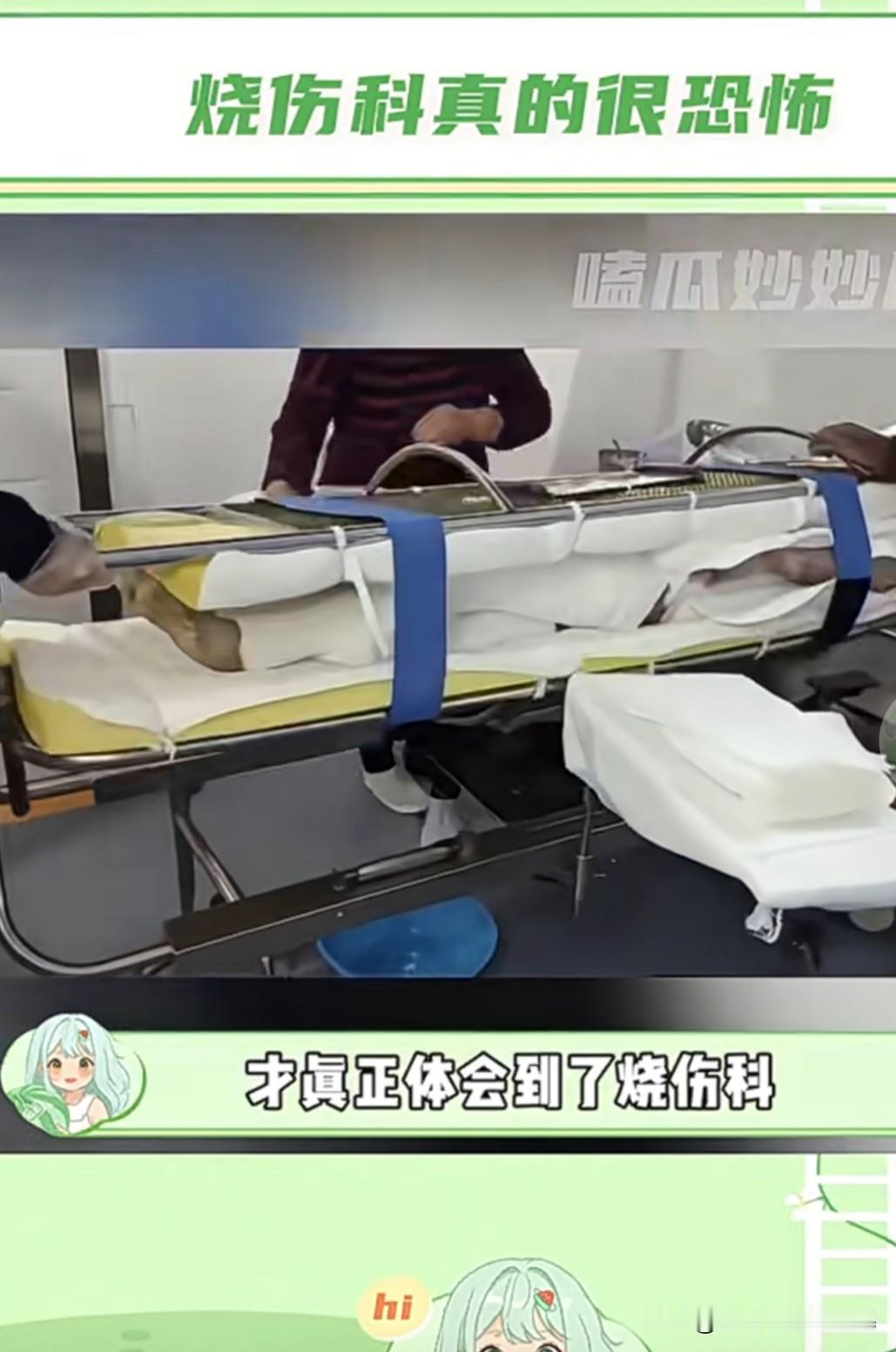 烧伤真的太疼了 曾经轻微烧伤过,换药的时候简直生不如死,包扎的纱布是与皮肉连在一起的,换药的时候会硬生生的扯下纱布,现在回忆起来还会起鸡皮疙瘩。 那种医院的烧伤科跟地狱一样,大面积烧伤的病人换药的时候就是在承受酷刑。看到大面积烧伤病人的翻身床治疗才真正体会到为什么烧伤科是最压抑的科室。 做清创,不打麻药的那种,还要拿钢丝球一样的医疗工具往伤口上刮,把那些死皮都给刮下来。 烧伤真的太痛苦了。