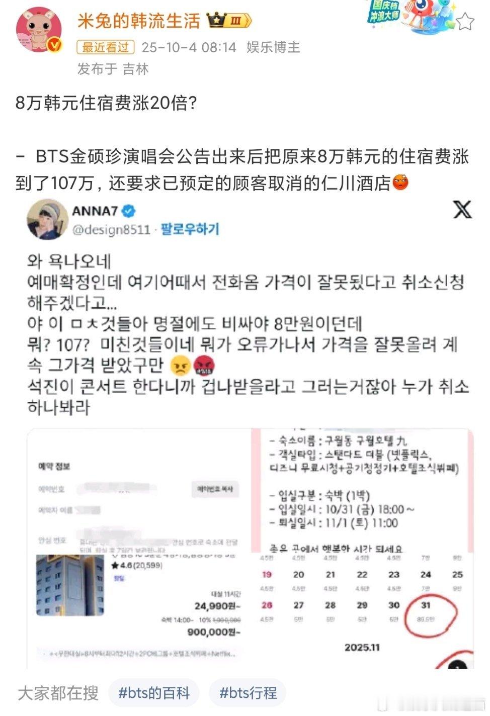 - BTS,金硕珍演唱会公告出来后把原来8万韩元的住宿费涨到了107万,还要求已预定的顾客取消仁川酒店。