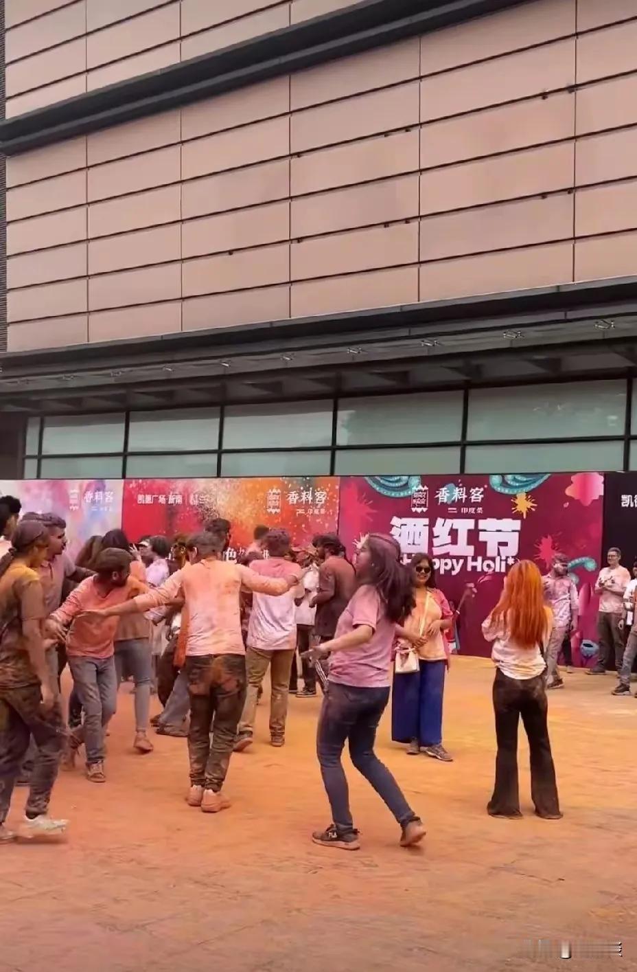 成都的朋友看过来,这是哪里? 门前的展示板写的是“洒红节”,洒红节是印度传统节日,在广场上有太多的印度朋友狂欢舞蹈。 成都有这么多印度友人吗?他们都是留学生吗?如果不是,那他们是什么签证在成都生活?还是说只是商家作秀,只是请了少数印度人表演? 私人场所他们可以尽情庆祝,公共场所这么做不妥吧?满地金粉让环卫工去扫?是不是不礼貌?也增加环卫工的工作量,如果印度人狂欢后能自行收拾卫生,那可太完美了。