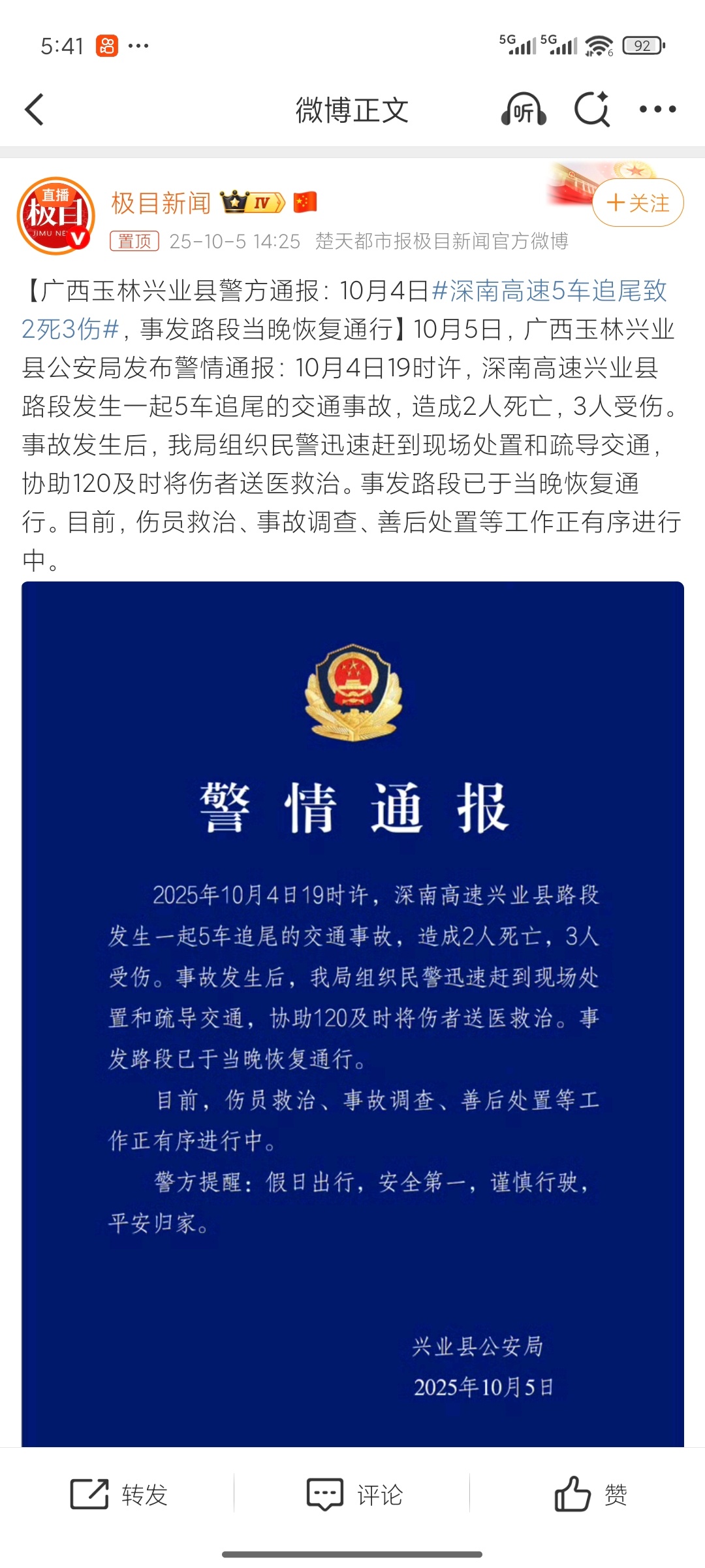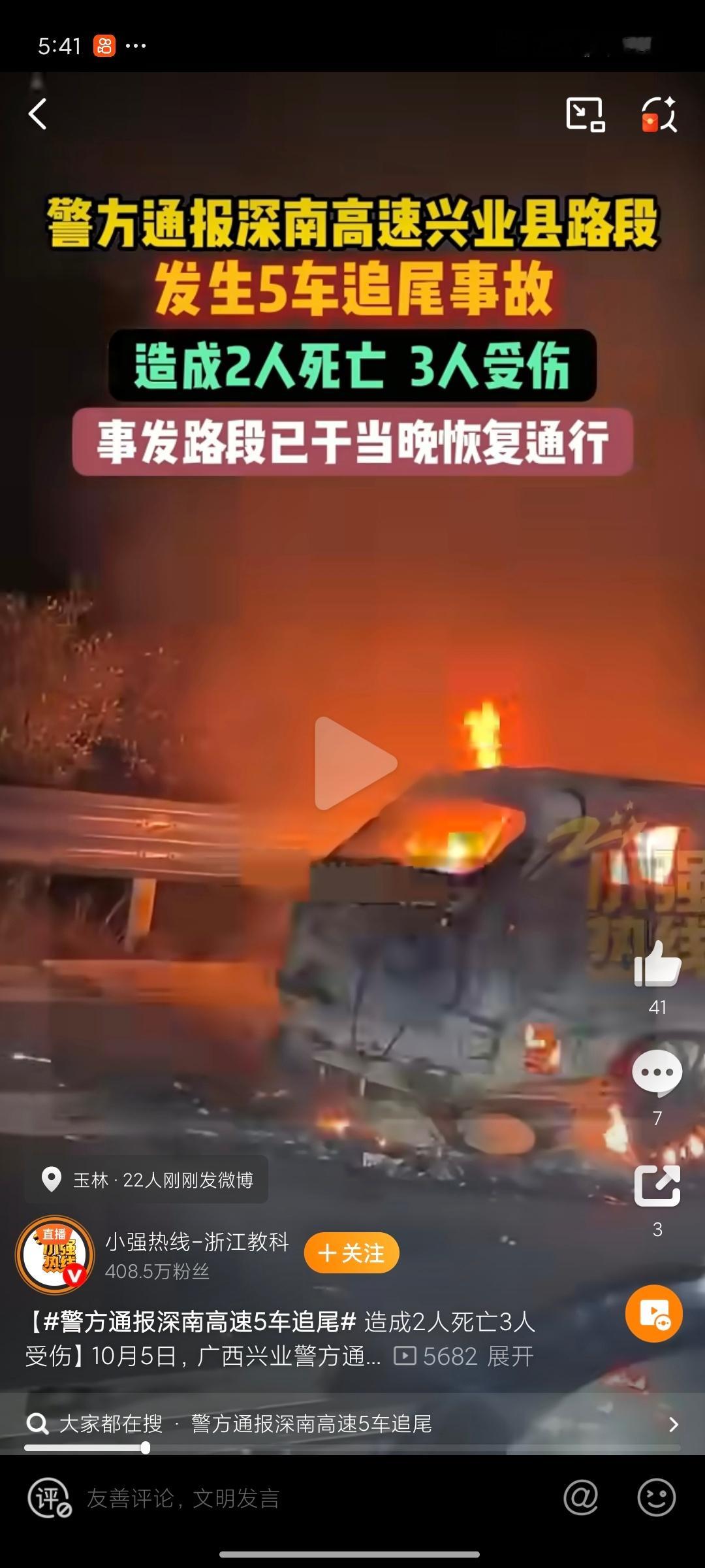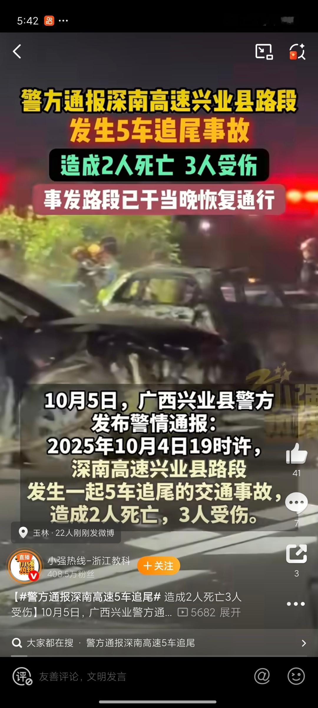 深南高速5车追尾致2死3伤怎么回事,假期的热搜都快被车祸承包了!