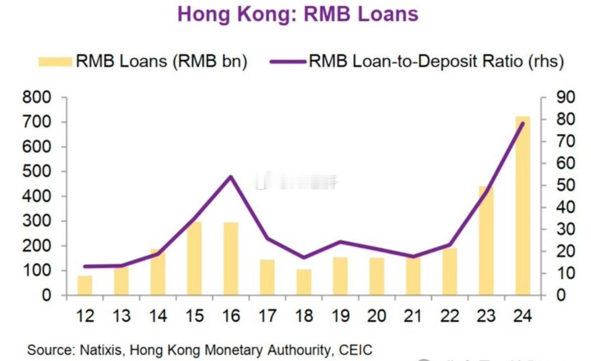 Natixis:2024年香港人民币贷款规模激增至约7000亿元,同时人民币贷存比也攀升至80%左右的历史高位。贷存比的显著上升表明,此轮贷款增长并非由利率套利驱动,而是反映了实体经济因人民币融资成本较低而产生的真实需求。这一趋势与香港作为离岸人民币中心地位的增强相符。