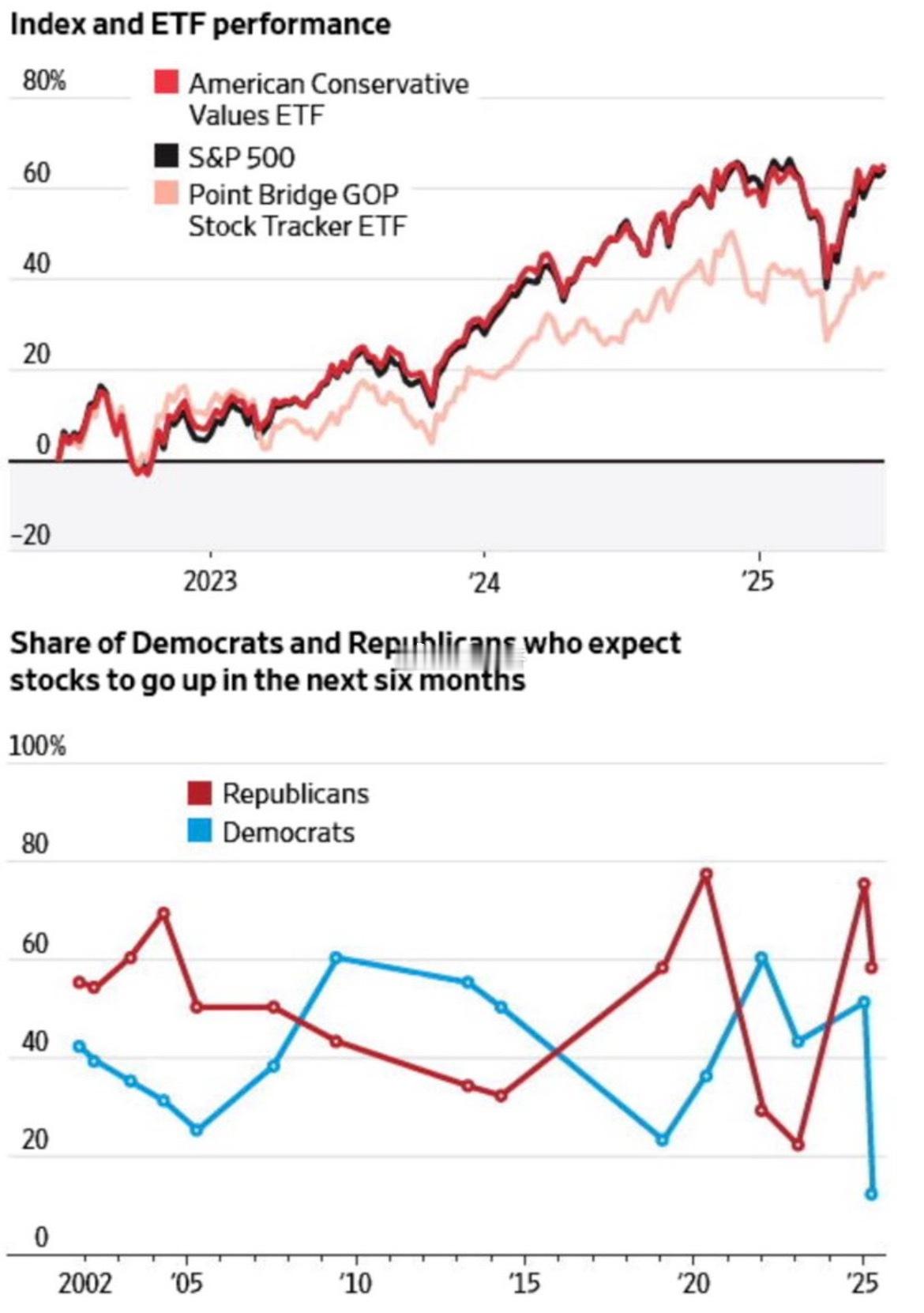 华尔街日报 随着美国政治分歧加剧,越来越多的投资者正根据其政治立场来做出投资决策,但历史数据表明这种策略可能会损害长期回报。根据盖洛普(Gallup)今年春季的一项民意调查,看好未来六个月股市前景的共和党人比民主党人多出47个百分点,这是自2001年以来最大的党派差距。这种分歧正转化为实际的交易行为,部分投资者因对现任政府政策的担忧而考虑将资产转移到海外,而另一些投资者则将市场回调视为买入机会。华尔街也顺势推出了迎合特定政治立场的产品,例如“美国保守价值观ETF”(American Conservative Values ETF)。然而,数据显示,基于政治的投资策略往往表现不佳。例如,一只“MAGA”主题基金的表现比标准普尔500指数落后超过20个百分点。此外,自1953年以来,简单的“买入并持有”策略所产生的回报,远超于仅在某一特定政党执政期间持有股票的策略。这印证了华尔街的一句格言:用投资组合玩弄政治并非明智之举。