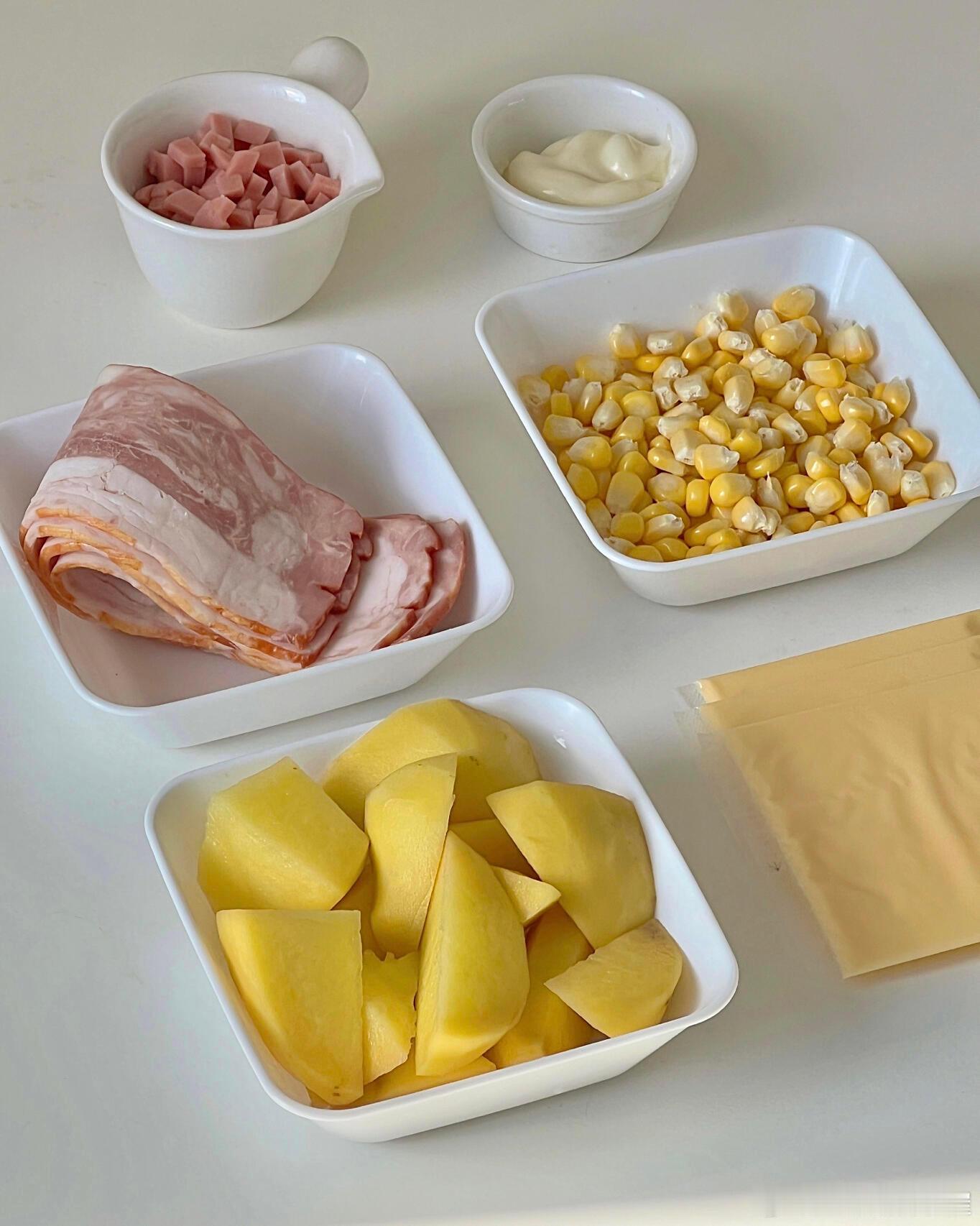 土豆、培根、火腿、玉米粒、芝士片、沙拉酱