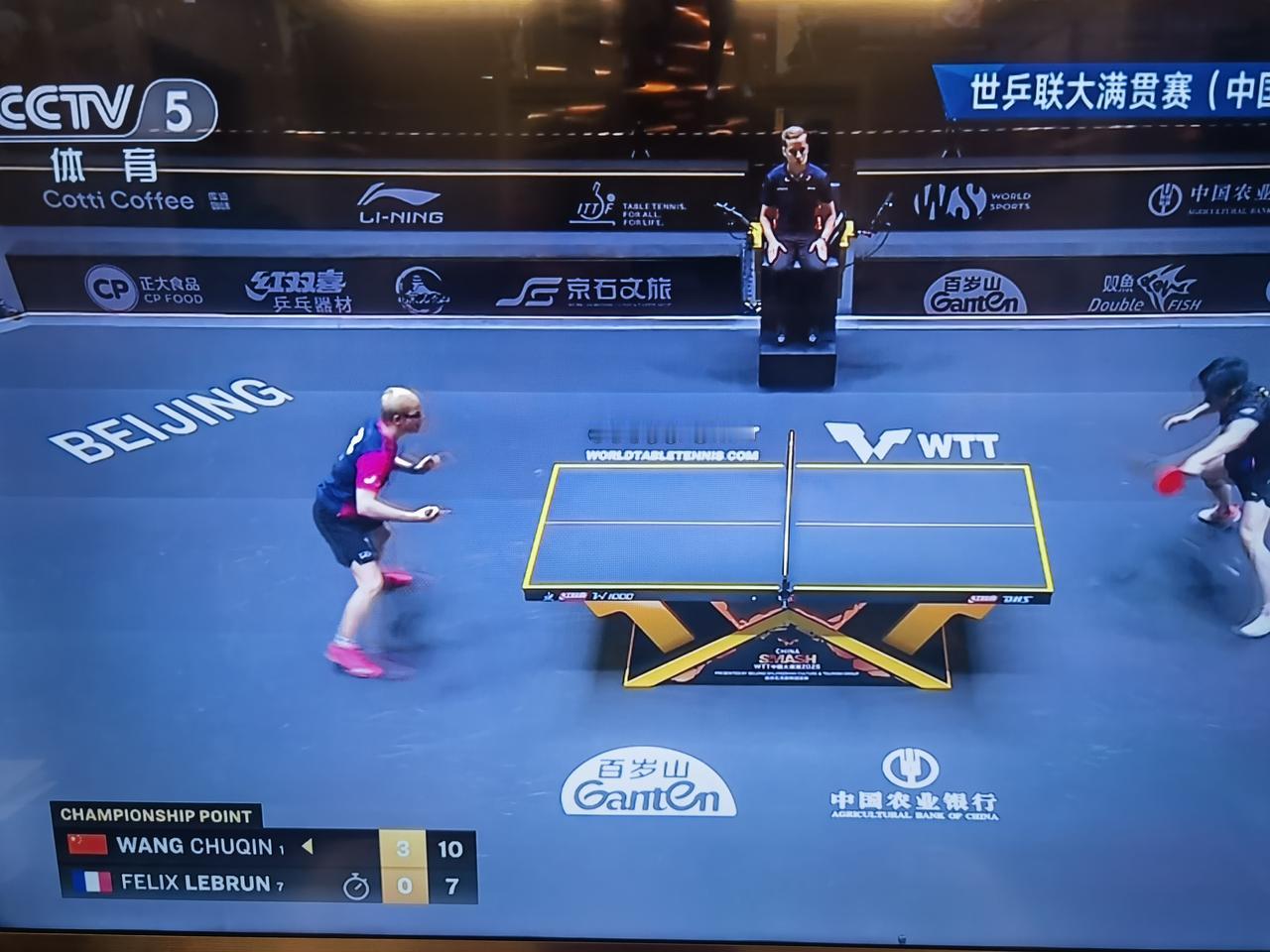 王楚钦夺冠!王楚钦实现了WTT北京站三冠王!王楚钦决赛的对手是法国的勒布伦,这场比赛,央视解说用的词是完胜、释放、酣畅! 这场比赛可以说是王楚钦在心理上完全是压倒了对方,也就是说,这个冠军是我的,在王楚钦的心中已经坚定!王楚钦这场比赛战术就是速战速决!从而,王楚钦11:7,11:2,11:5,11:7,完胜夺冠!从而实现了本次大赛的男双,混双,男单三冠王!