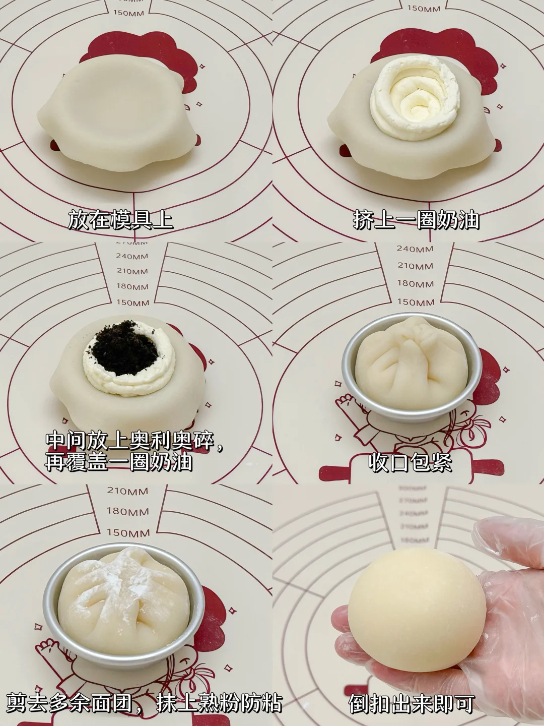4️⃣取40g/个面团擀成圆形,放在模具上,挤上一圈奶油,放上奥利奥碎,再覆盖一圈奶油,收口包紧,剪去多余面团,抹上熟粉防粘,倒扣出来即可。