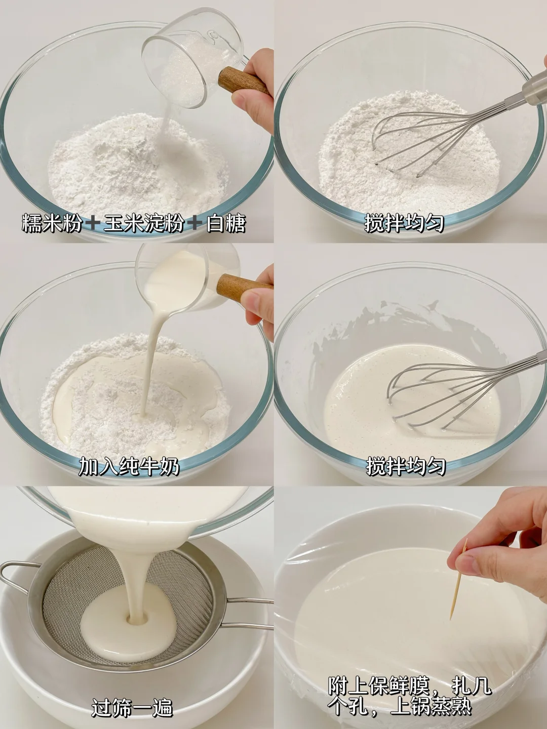 1️⃣糯米粉+玉米淀粉+白糖搅拌均匀,加入纯牛奶搅拌均匀,过筛一遍,附上保鲜膜,扎几个孔,上锅蒸25分钟左右。