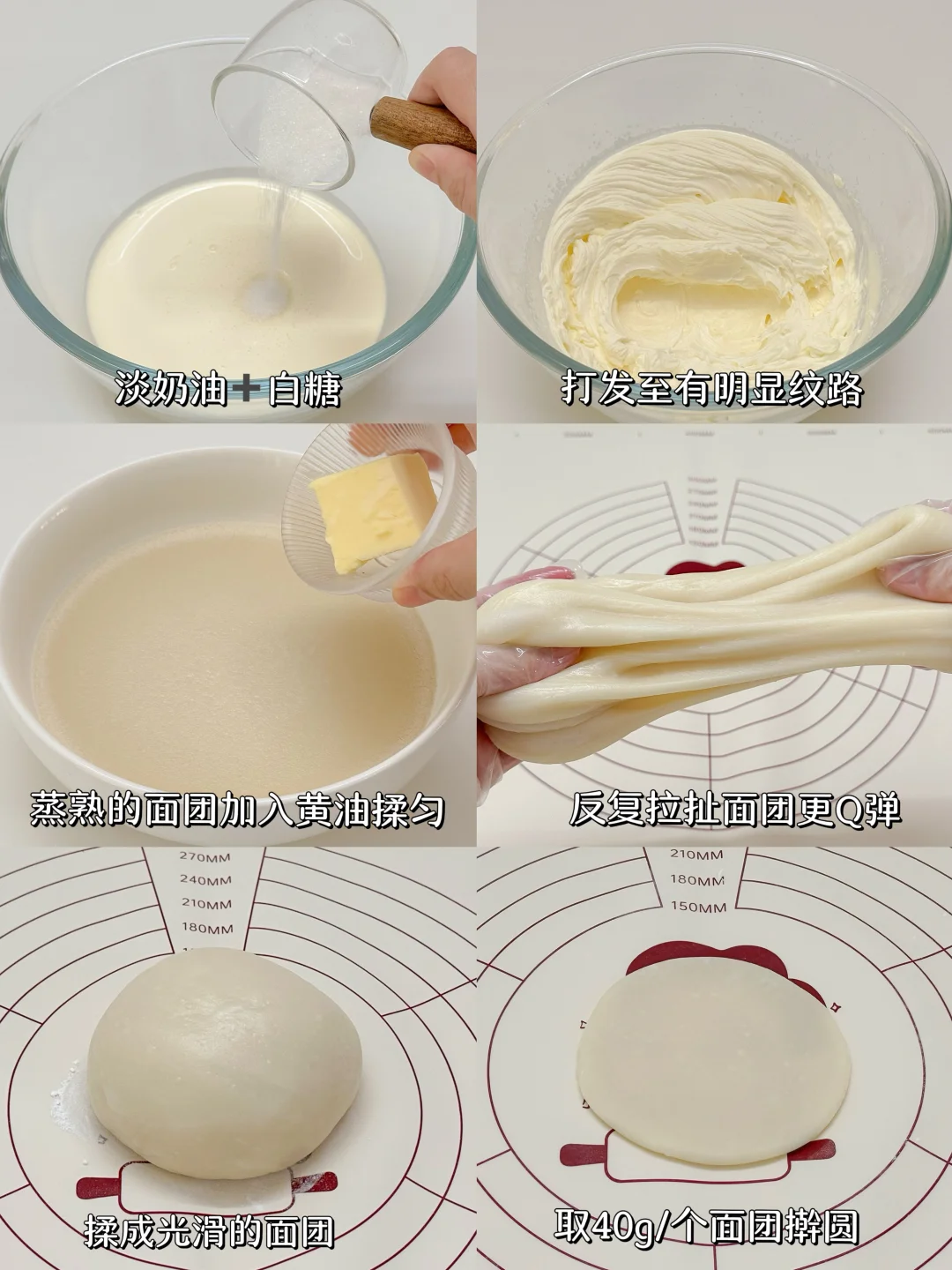 3️⃣蒸熟的面团加入黄油揉匀,反复拉扯面团更Q弹,并整理成光滑的面团。