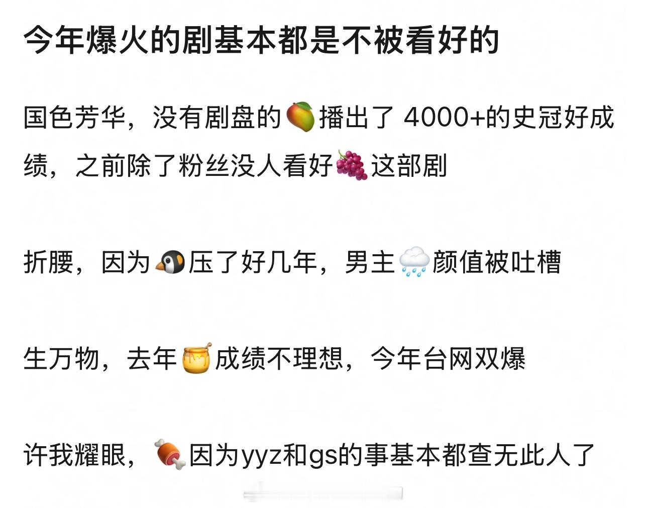 认同吗?今年爆火的剧基本都是不被看好的