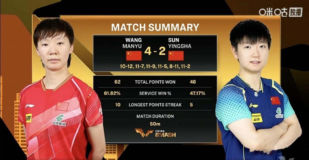 六局比分为:10-12、11-7、11-9、11-5、8-11、11-2,国乒包揽本届中国大满贯女单冠亚军。王曼昱本届比赛斩获女双、女单两冠,孙颖莎收获混双冠军和女单亚军。