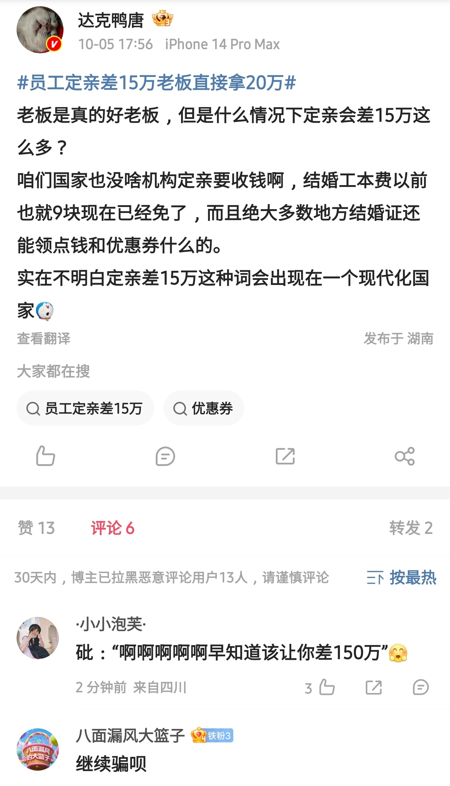 这个老板这个老板本意是好的,但是,定亲都能差15万,后面结婚差的口子该有多大呀?
