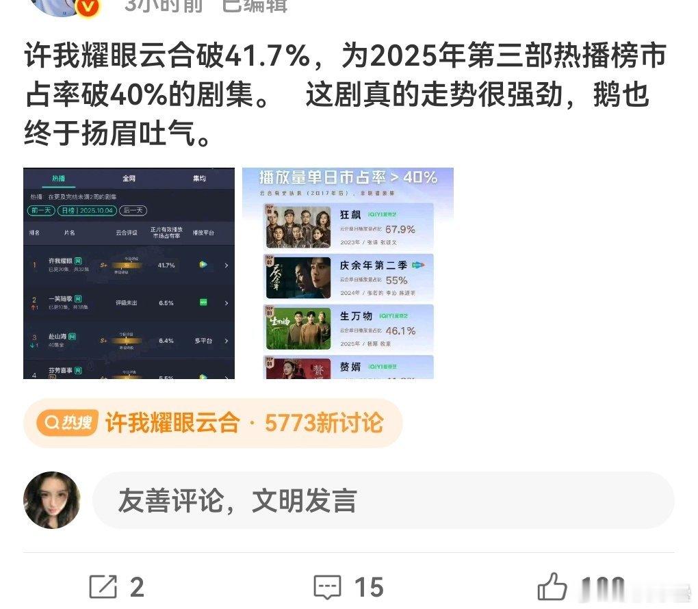 战丝还是厉害,今年开年之后特有的“一堆扑里一还行or热播”的局势,让战丝首创了的“不吹数值吹占比”,吹上刚好40.1%的占比,然后所有营销号都不卡50%卡40%,前面可以4300硬吹唯一“大爆”,后面可以4300捆绑真热播剧火剧,顺便捆前两年的爆or运气好火且占比高的剧