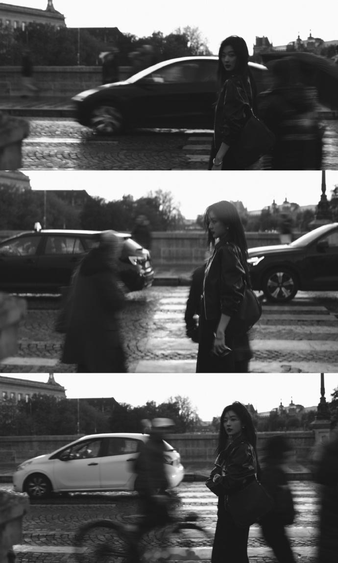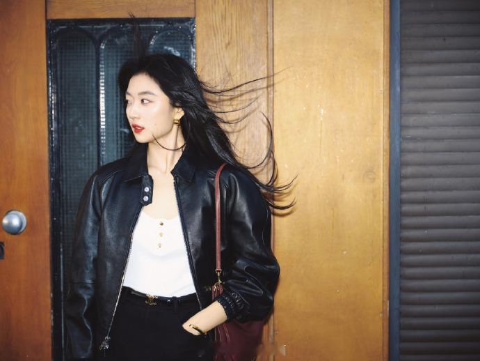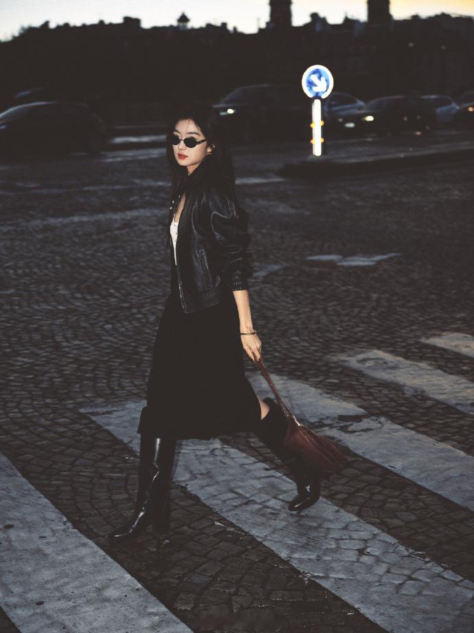 巴黎河畔的风也偏爱孙千孙千于巴黎河畔现身,暗夜红唇与黑皮衣的搭配,复古飒姐风扑