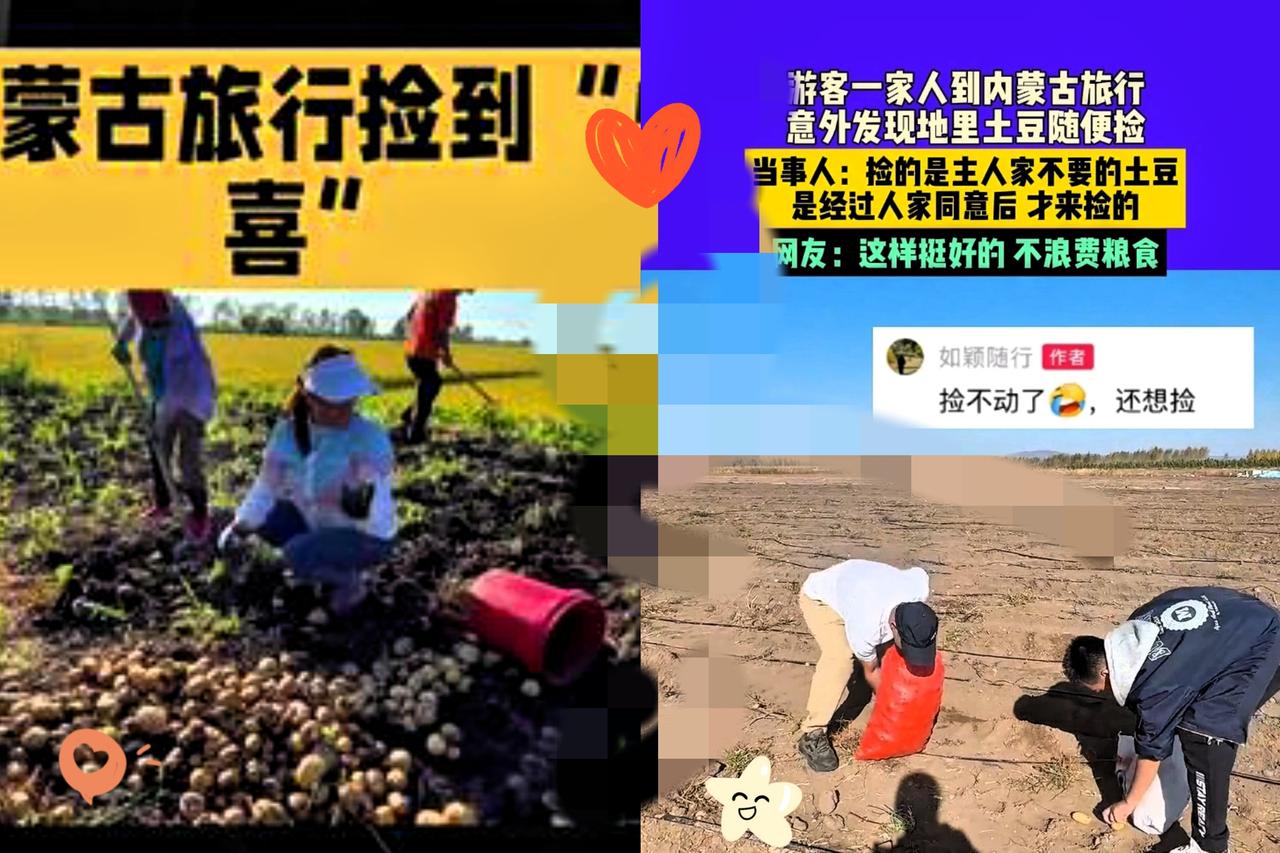 男子一家三口去内蒙古icon旅行,意外发现路边地里有很多土豆,竟然跑到地里捡土豆, 农户不光不拦,还抱来一摞塑料袋扔地上:“不够再要!”有人捡得后备箱快满了,还拉着老婆喊“给别人留点”。 这哪是捡土豆?是捡着了人与人之间的实在——农户省了翻地的劲,游客得了新鲜好土豆,连内蒙的口碑都跟着涨! 比景区标语管用的,从来都是农户递塑料袋的手、那句“随便捡”的敞亮。你遇过这种旅行里的暖心小事吗?来唠唠~捡土豆 内蒙土豆