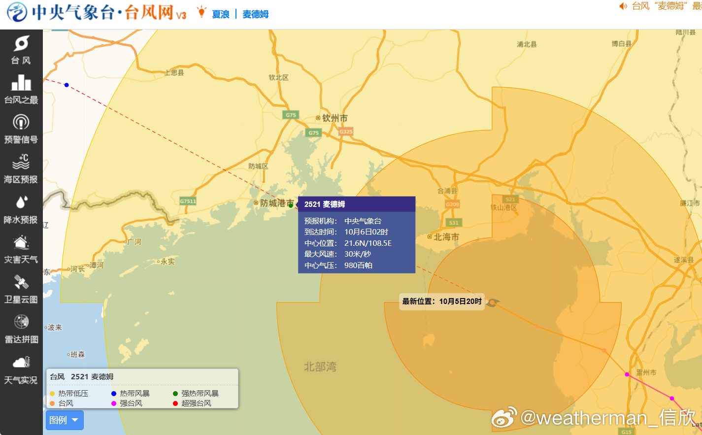 台风麦德姆今晚麦德姆中心已经进入北部湾,正在从广西北海南侧近海掠过。今天下午,